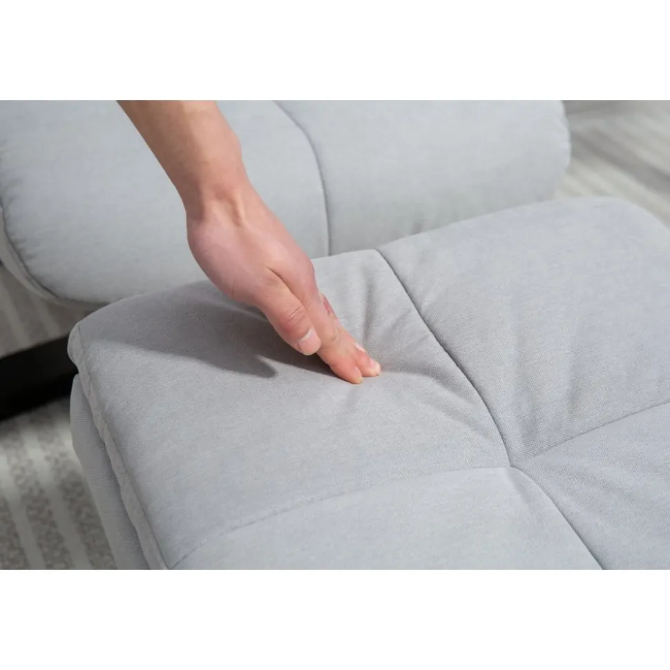 Duva och fotpall med förvaringsdel i fotpallen. Både och fotpall är klädda i slitstarkt skönt grått tyg. Snurrbart underrede till fåtöljen. Fåtöljen är även ställbar för att ge användaren sin favorit position.