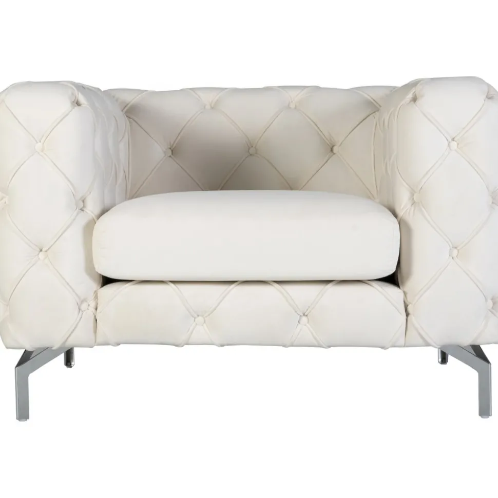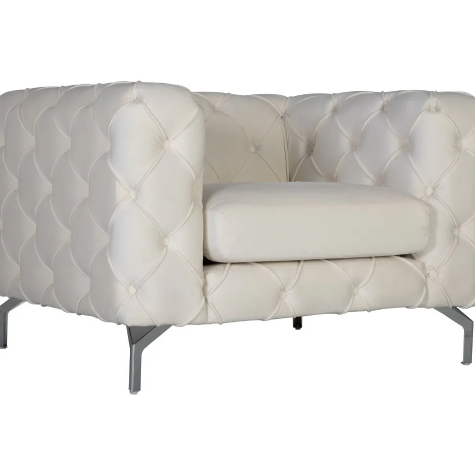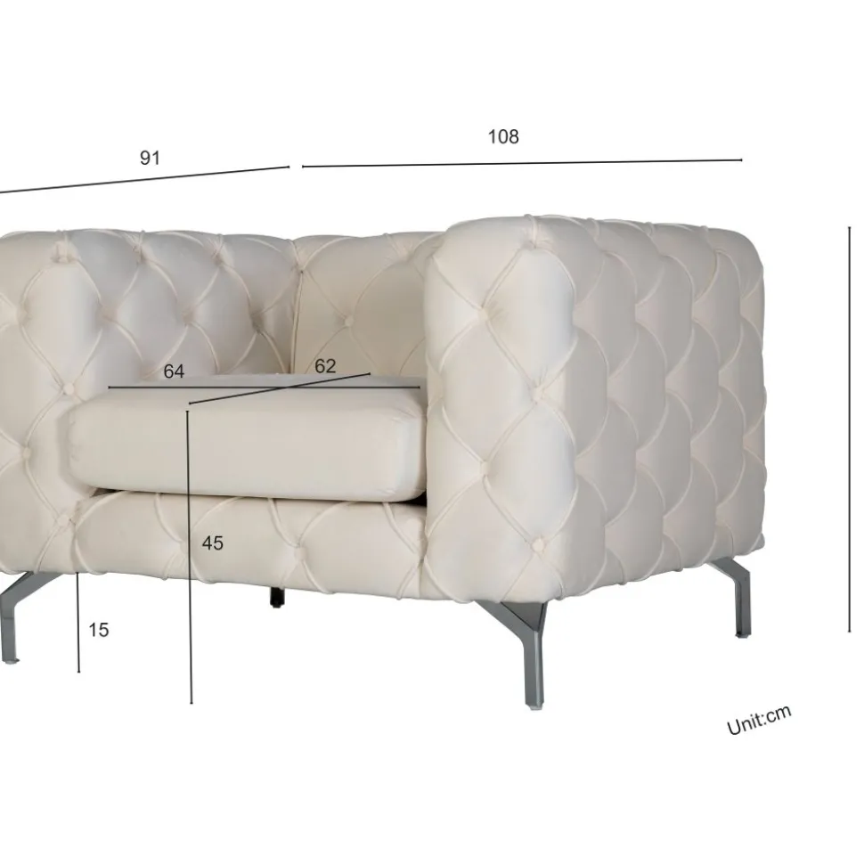 Fåtölj i en modernare variant av chesterfield. Fåtöljen har fasta ryggdynor, löstagbara sittdynor och ett tyg som kan kemtvättas.