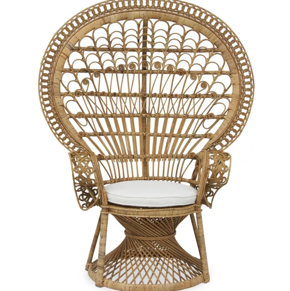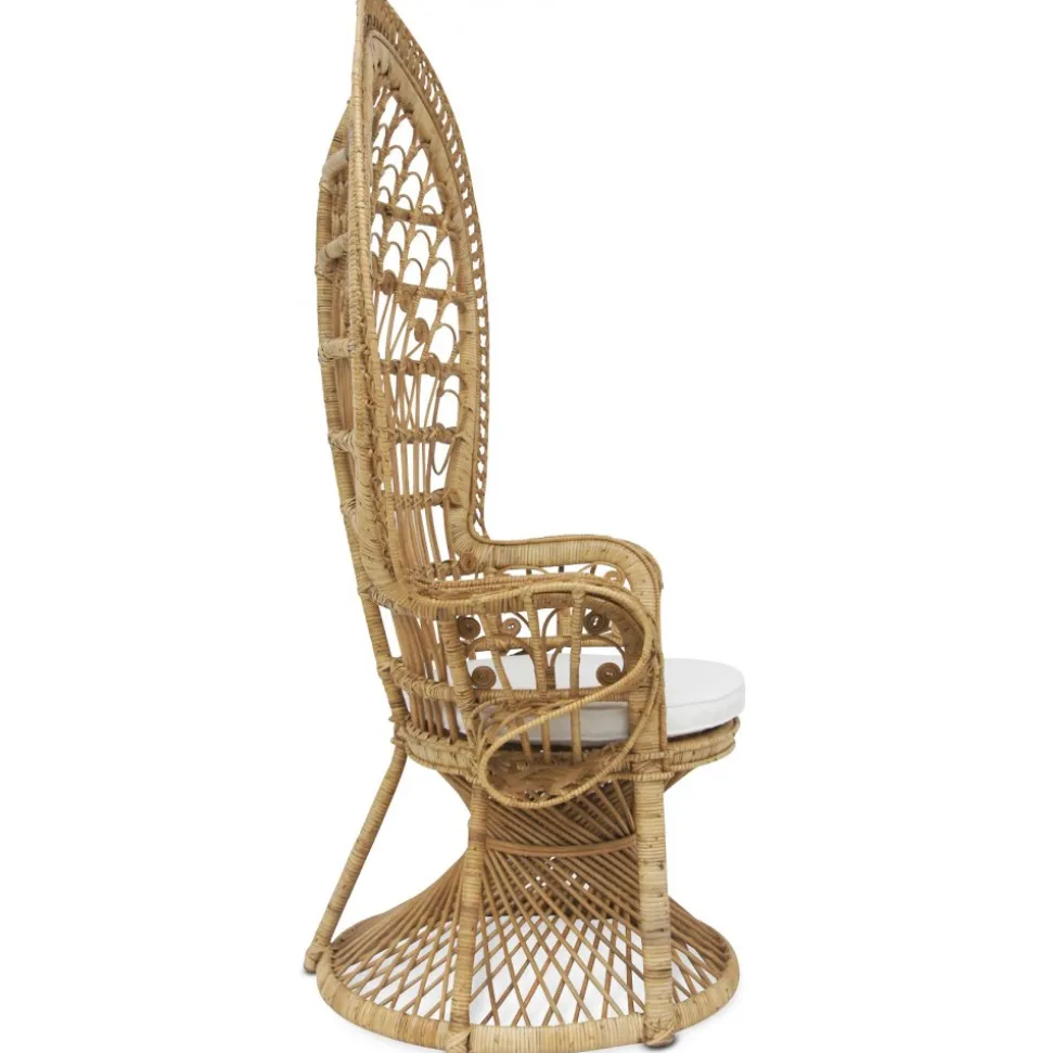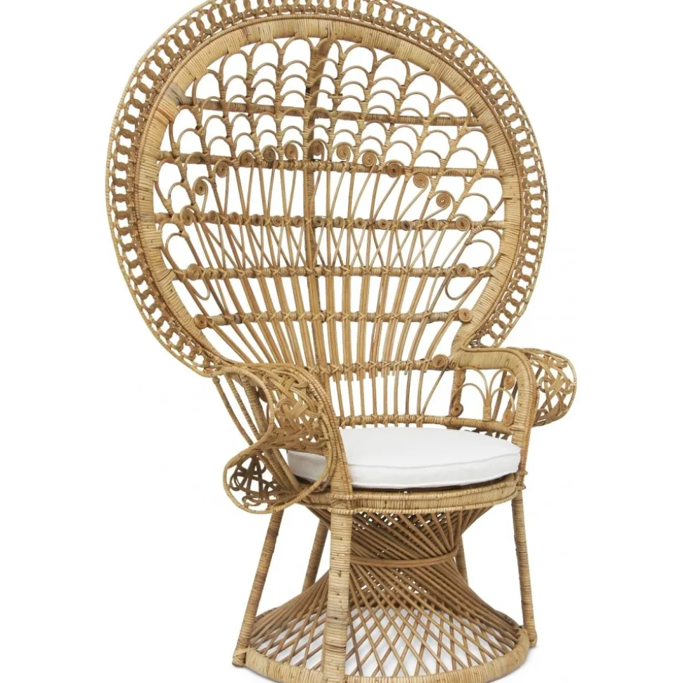 Påfågel fåtölj, även känd som Peacock, är en klassisk möbel tillverkad av flätad och bunden naturlig rotting. Denna är ett fantastiskt handarbete som erbjuder hållbarhet och tidlös skönhet. Med en rund sittdyna i ljust tyg kombinerar den både komfort och stil, vilket gör den till ett perfekt tillskott till alla hem.