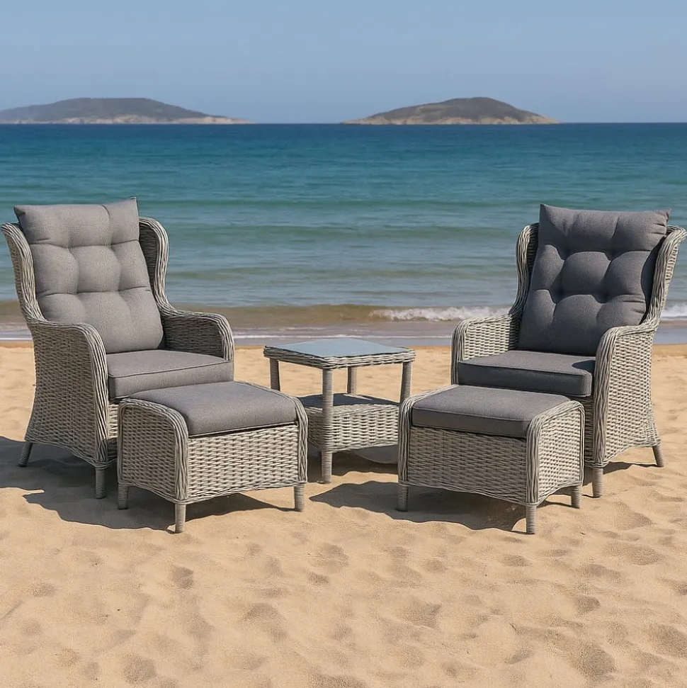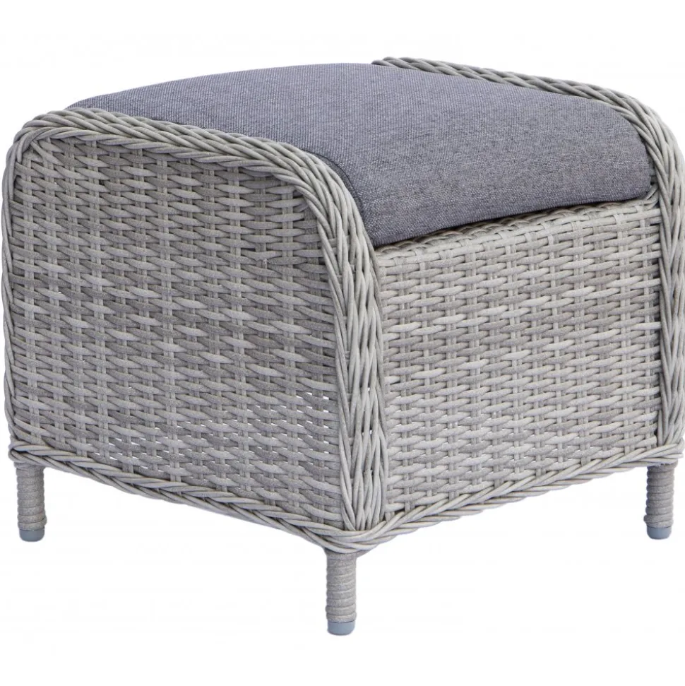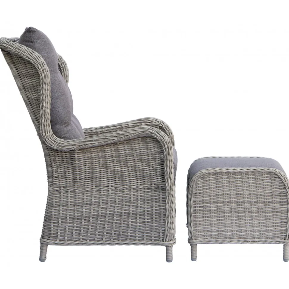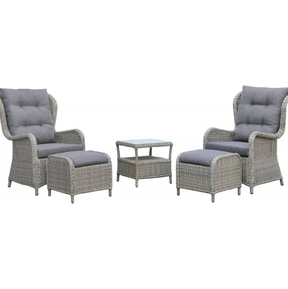 Utemöbelsetet består av 2 st bekväma fåtöljer med matchande fotpallar och ett sidobord samt dynset. Möbelsetet är tillverkat i aluminiumram med grå konstrotting och grå dynor. Rundad exklusiv konstrotting för rätt kvalitetskänsla. Sidobordet har en skiva av tempererat glas.