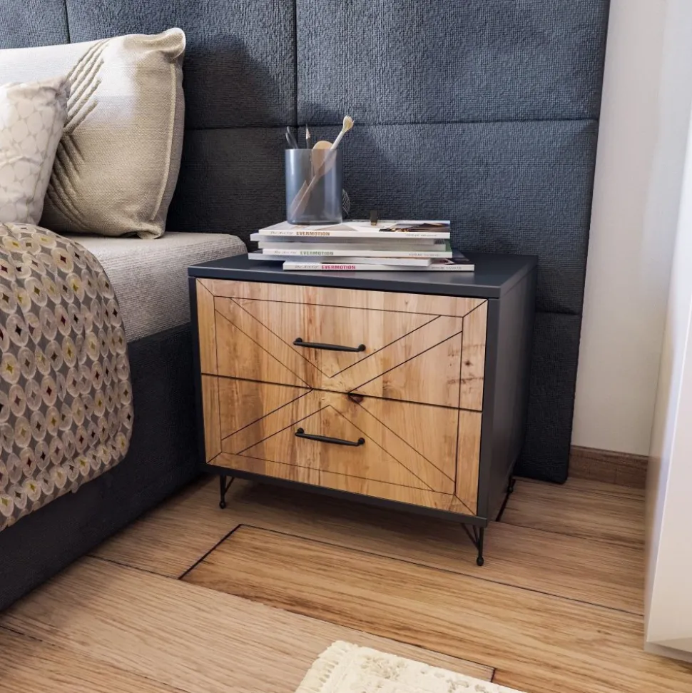 Sängbord av trä och metall.