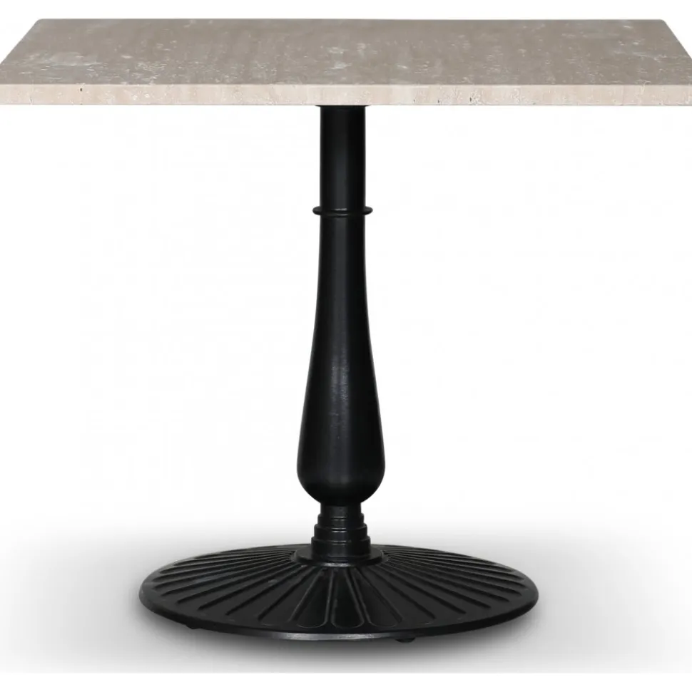 Flair och soffbord är naturligt vackra då toppskivan alltid är av en sten. Denna modellen har en snygg fyrkantig toppskiva i äkta Travertin kalksten. Alla travertin stenar är unika med dess mönster och håligheter för att ge den naturliga känslan. Bordsfoten är av svartlackad gjuten metall för att ge stabilitet.