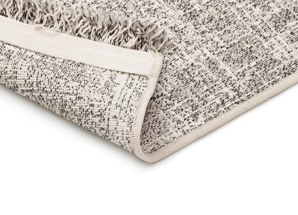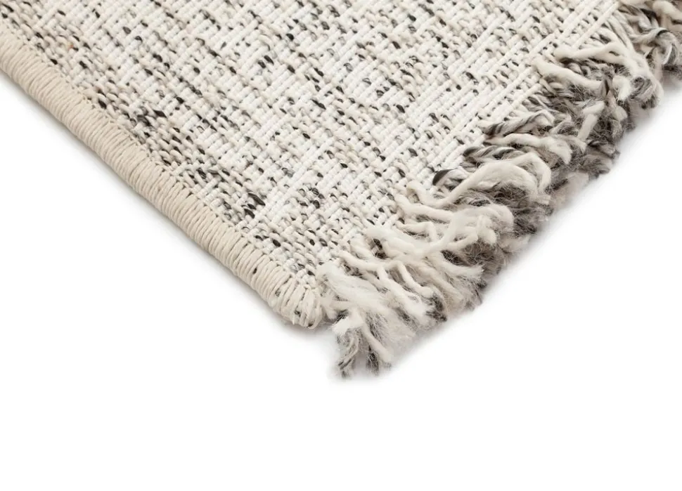 Garnet är en stilren som har cremevit bottenfärg med grå inslag. Mattan har ett diskret rutmönster och cremevit langettering på långsidorna, medan kortsidorna pryds av snygga fransar.