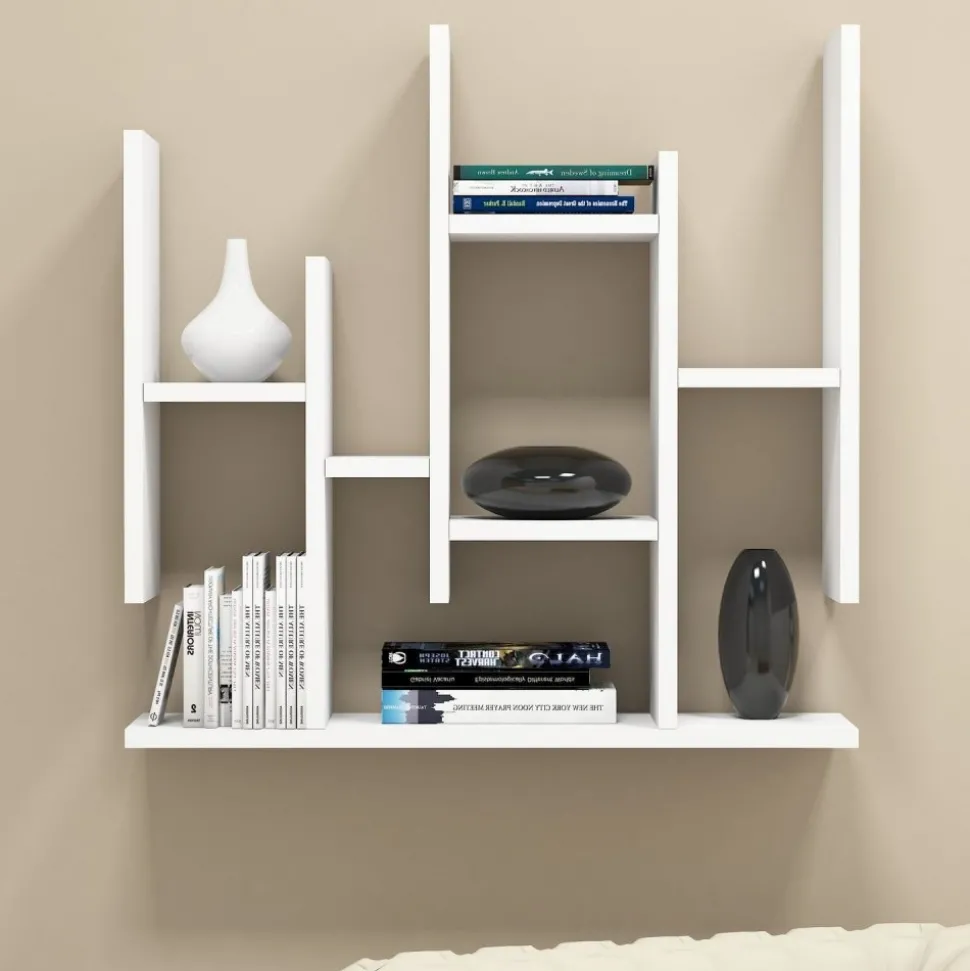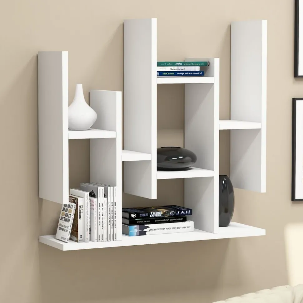 Vägghylla av melaminbelagd spånskiva.