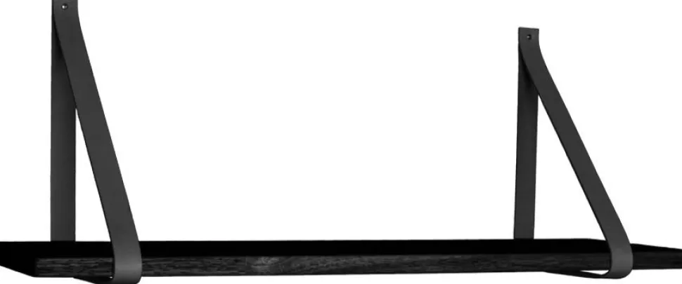 Vägghylla i svart med svarta läderbälten.