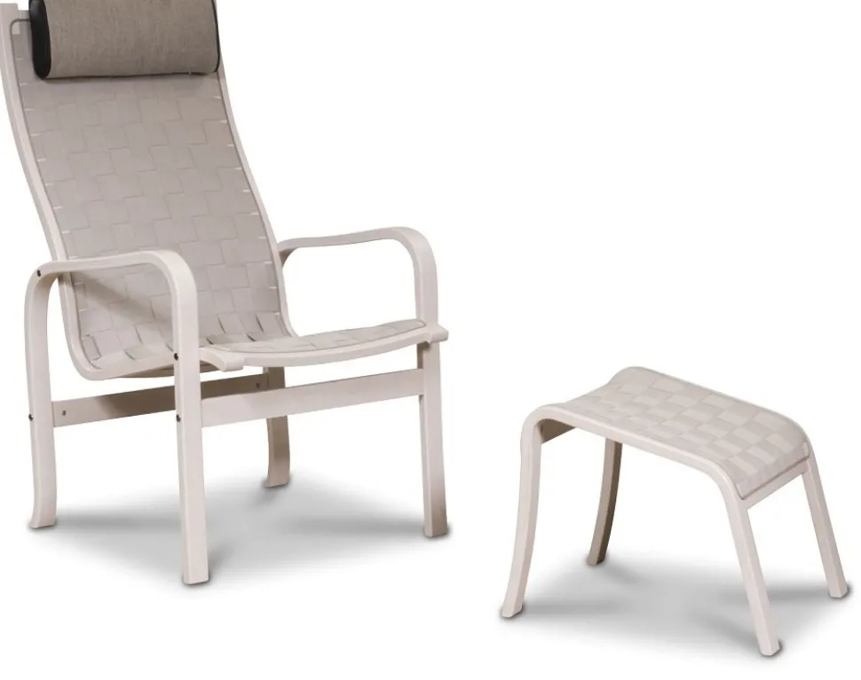 Frank fotpall är designad i Danmark av Nielsen design med känsla för det skandinaviska hemmet. Möbeln är klädd i sadelgjord med välarbetade ben i vitpigmenterad bok.