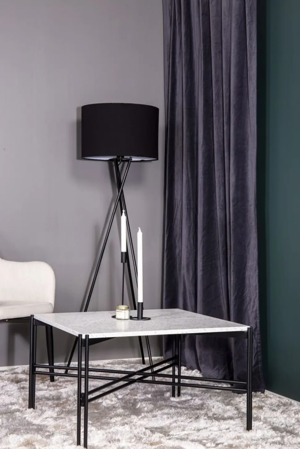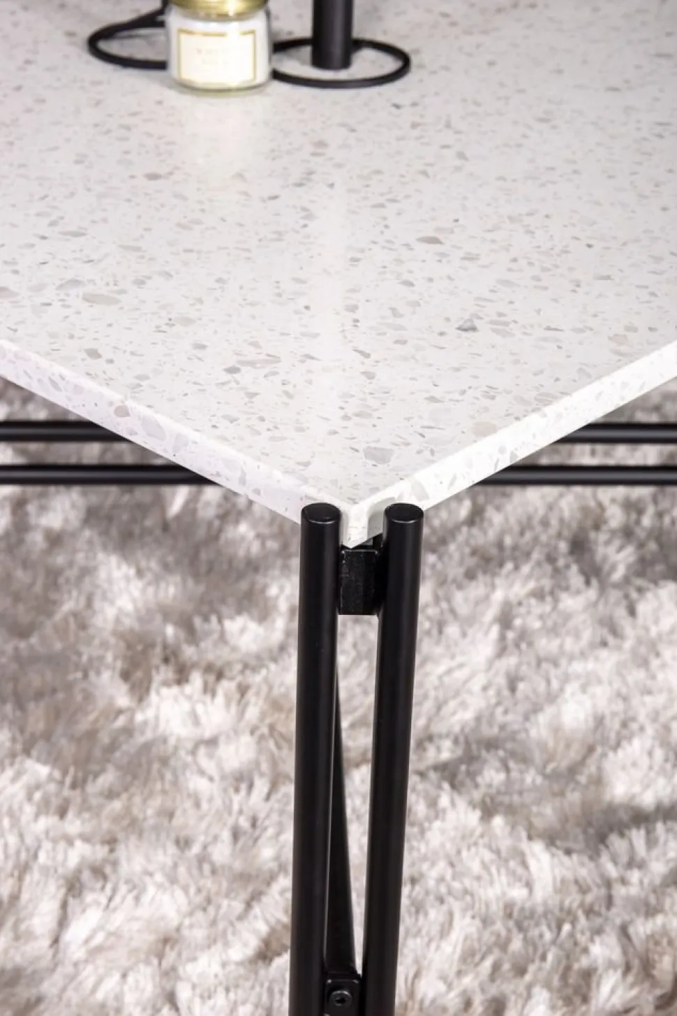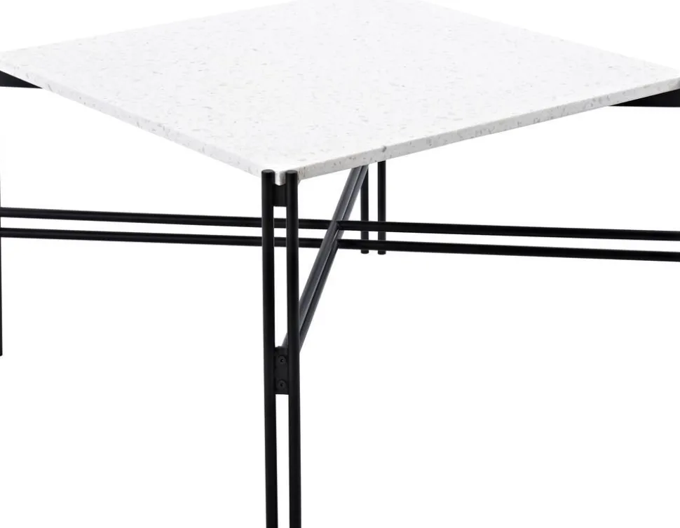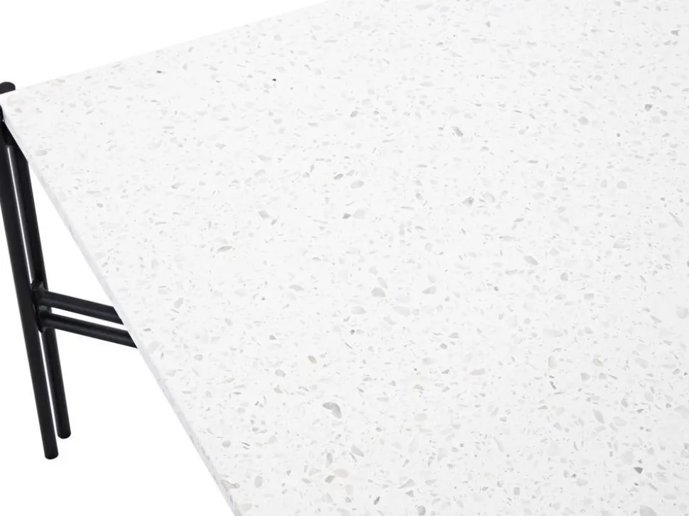Soffbord med vit Terazzo marmorskiva med underrede i svart metall.