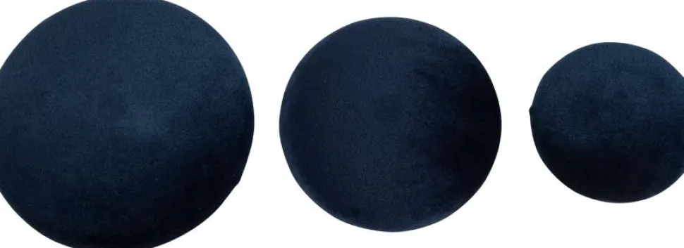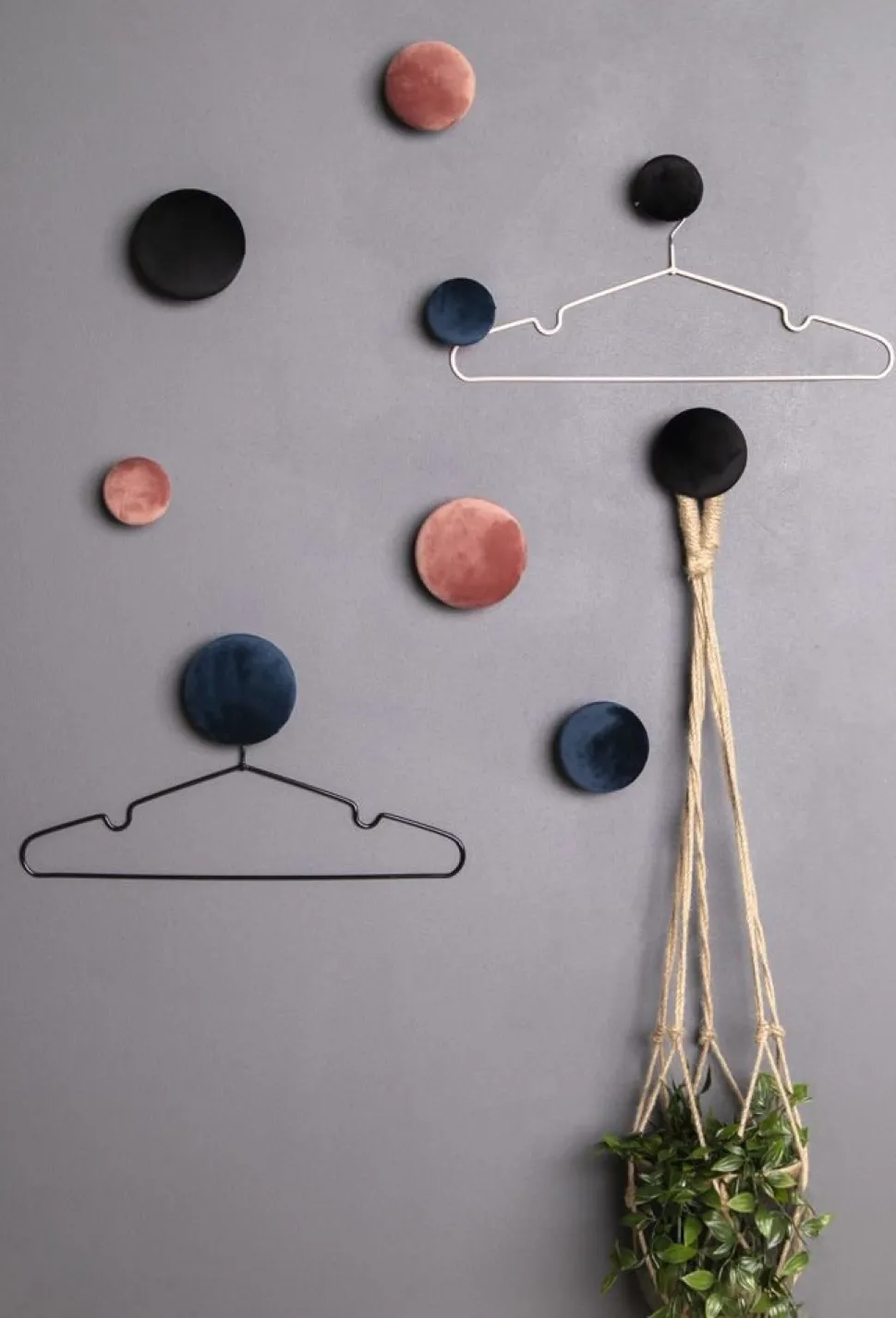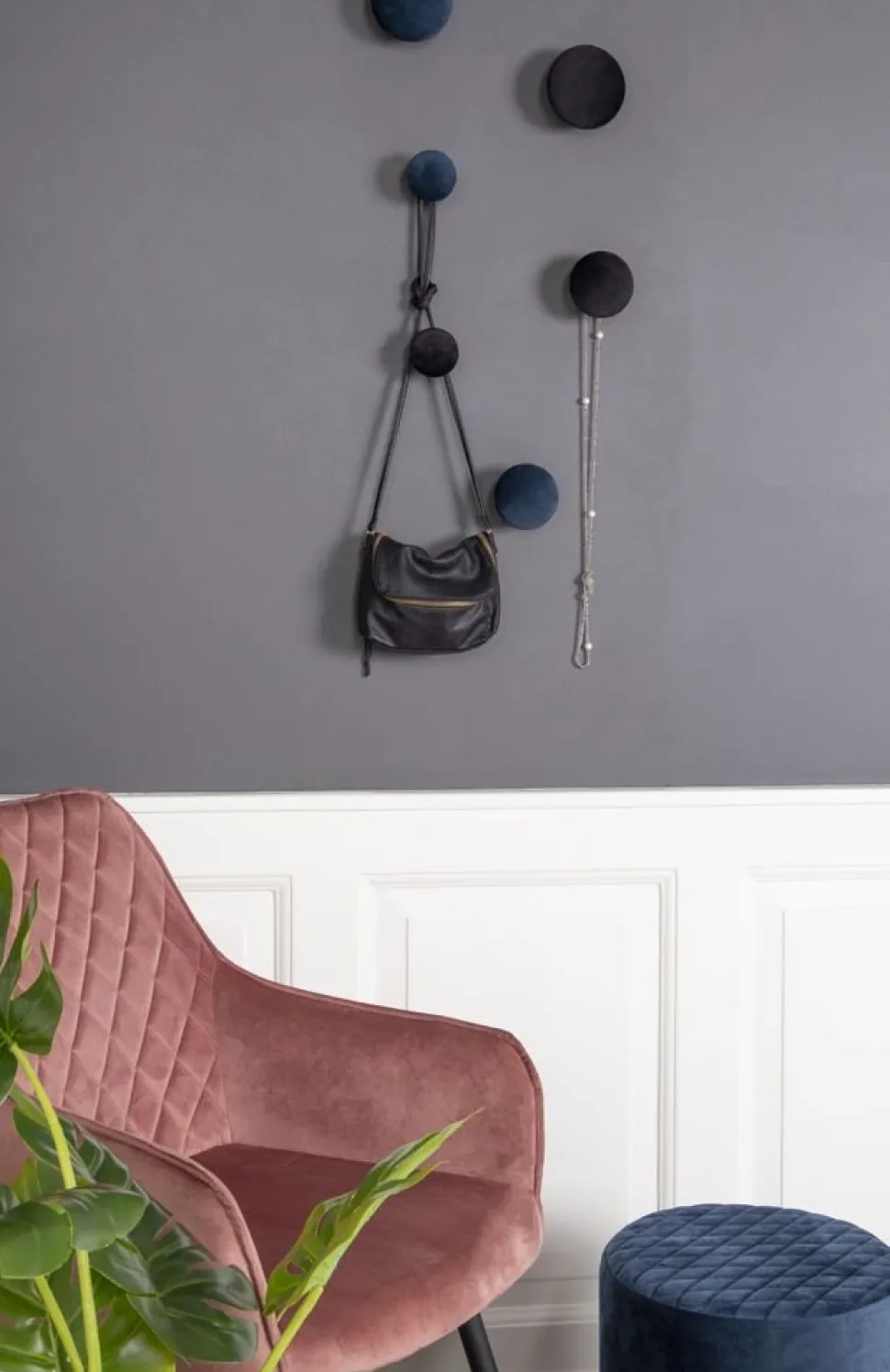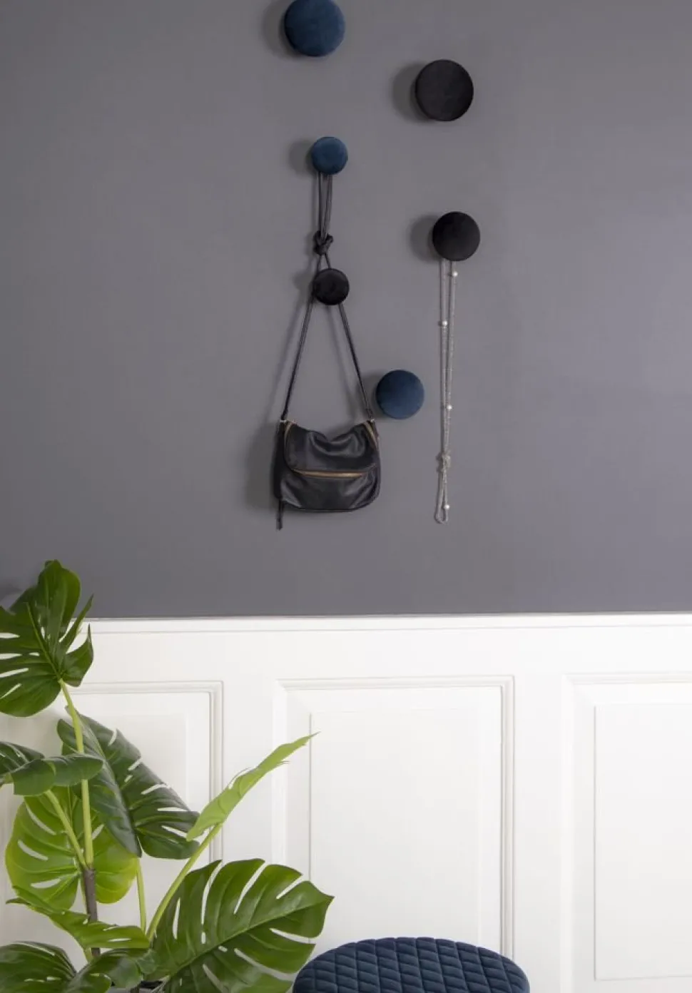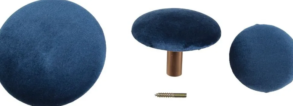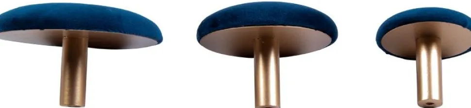 Set med 3 väggknappar för upphängning i blå velour och mässings utförande.