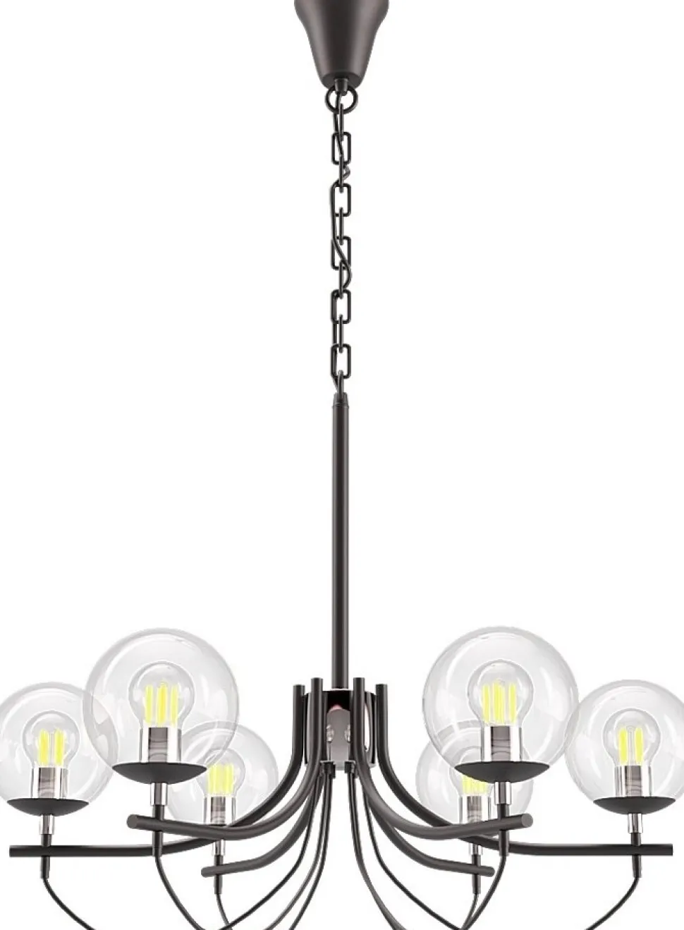 Glaslykta takkrona i trendig retrodesign. Svart metall med kromade detaljer och glasbollar. En stor och pampig takkrona med 5 st ljuskällor.