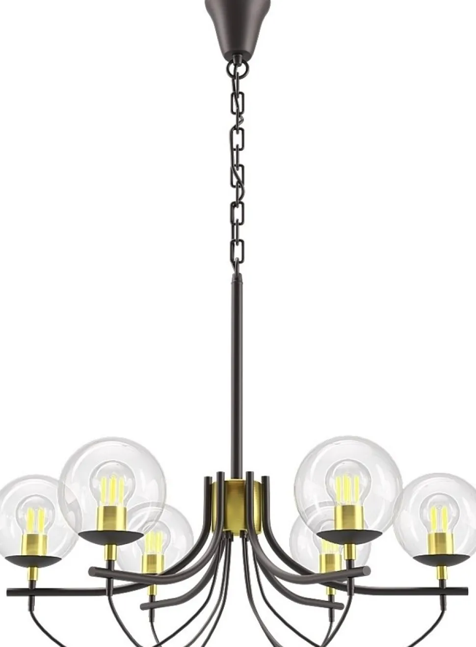 Glaslykta takkrona i trendig retrodesign. Svart metall med mässingsdetaljer och glasbollar. En stor och pampig takkrona med 6 st ljuskällor.