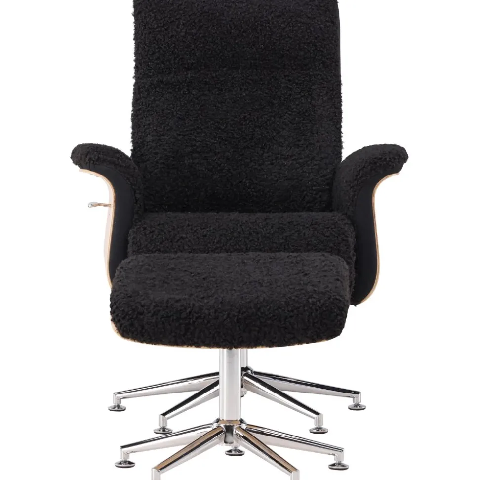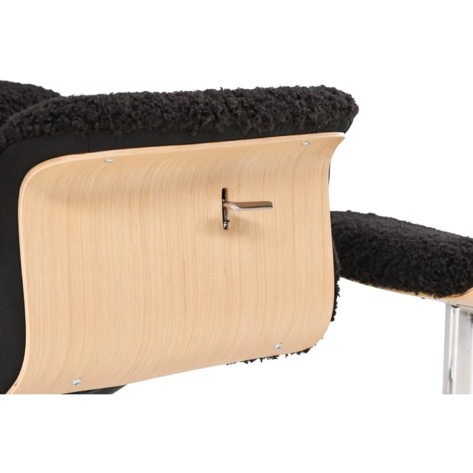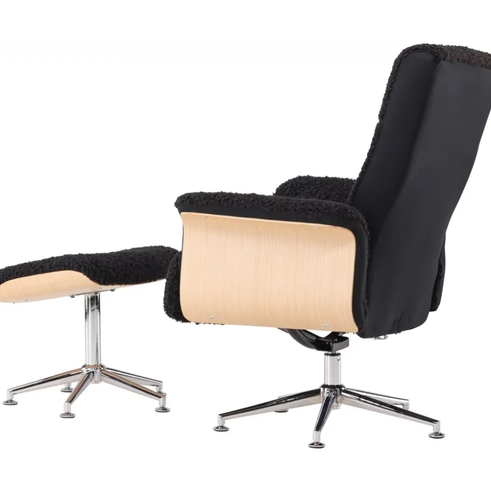Här i svart teddy med trä på sidorna i oljad ek-utförande. Snurrbart golvstativ i kromad metall för att återge ett exklusivt utseende och känsla. Reclinerfunktionen går att ställa och låsa i olika ställningar. Matchande fotpall ingår.