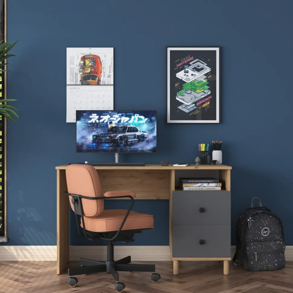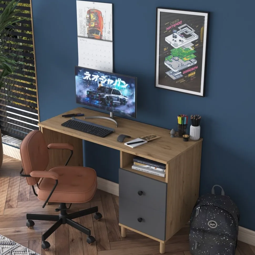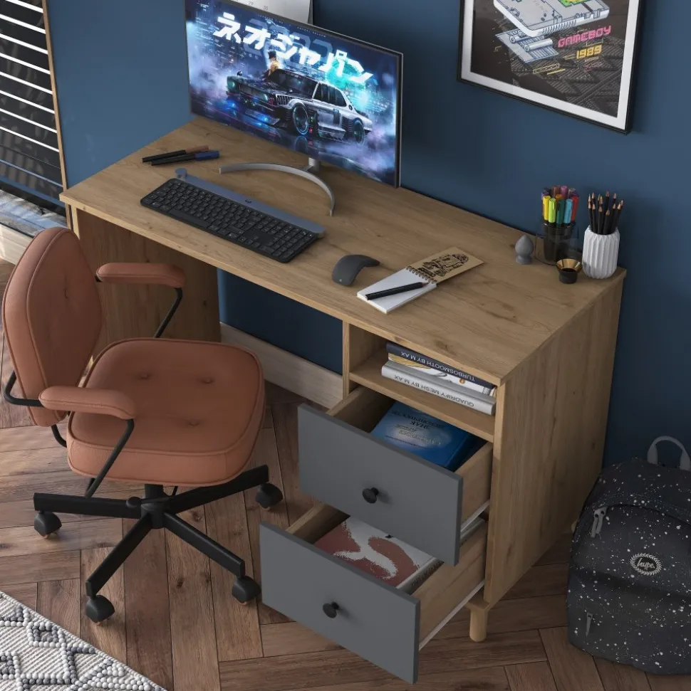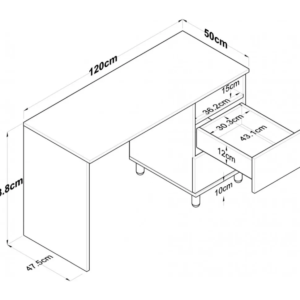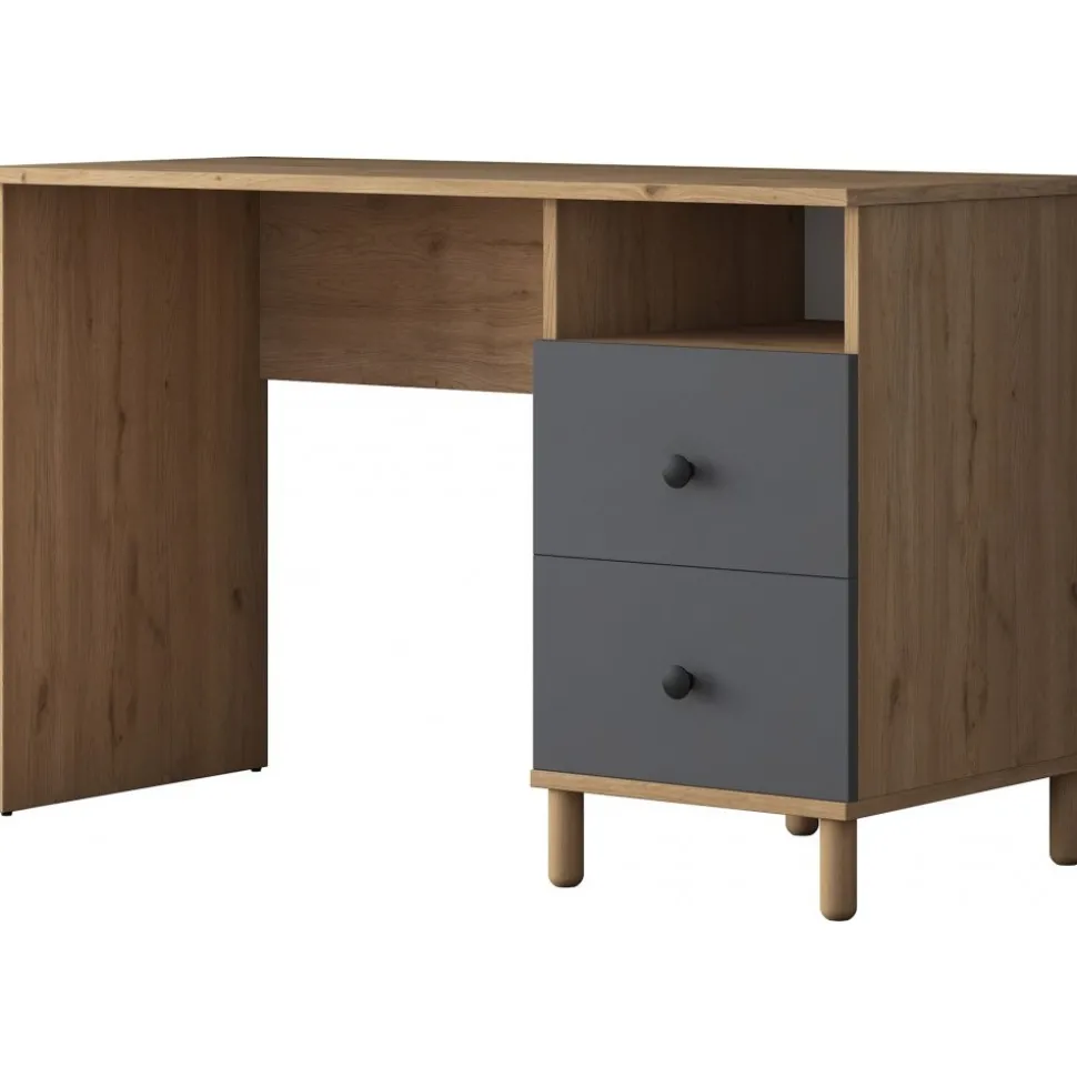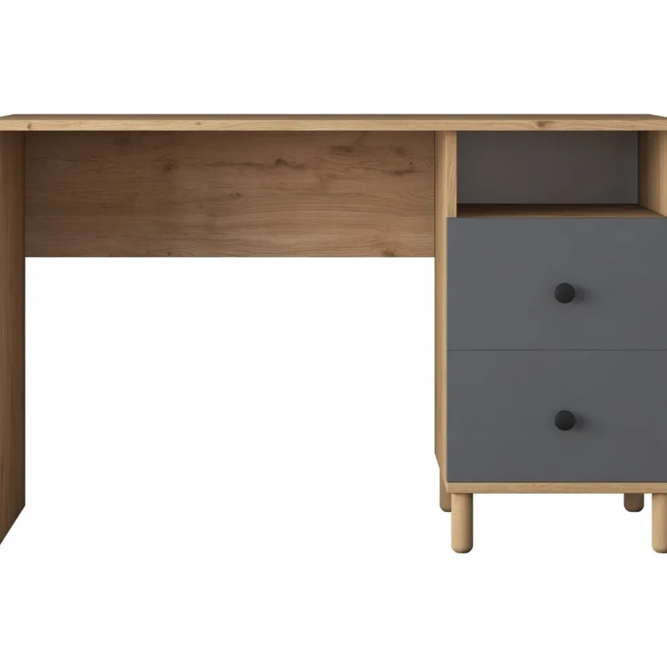 Skrivbord av melaminbelagd spånskiva.