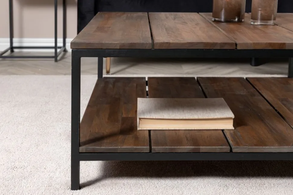 Soffbord i en vintage-look med sin toppskiva av limmad teak i vintage brunt utförande. Stomme av svart metall.