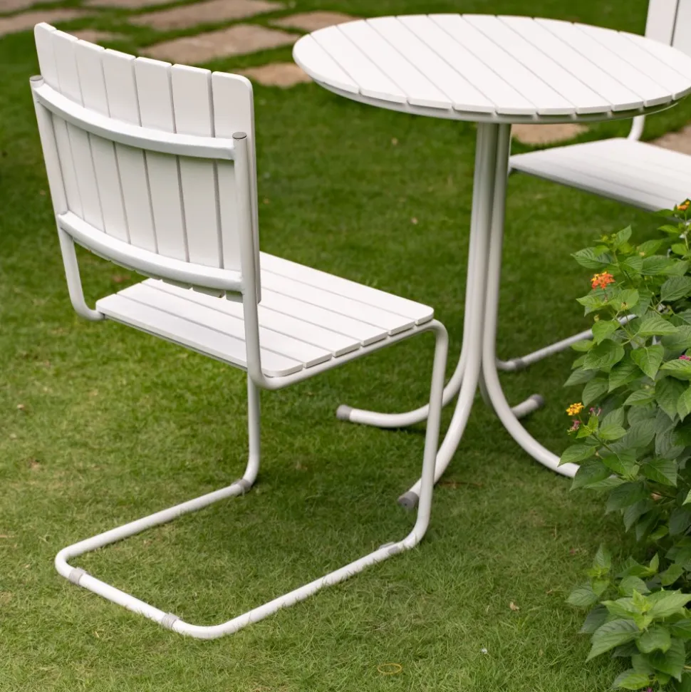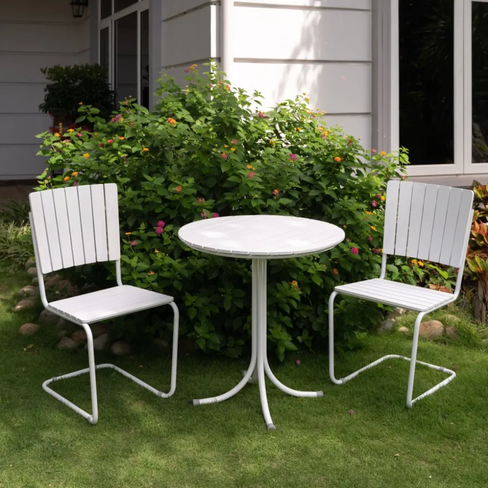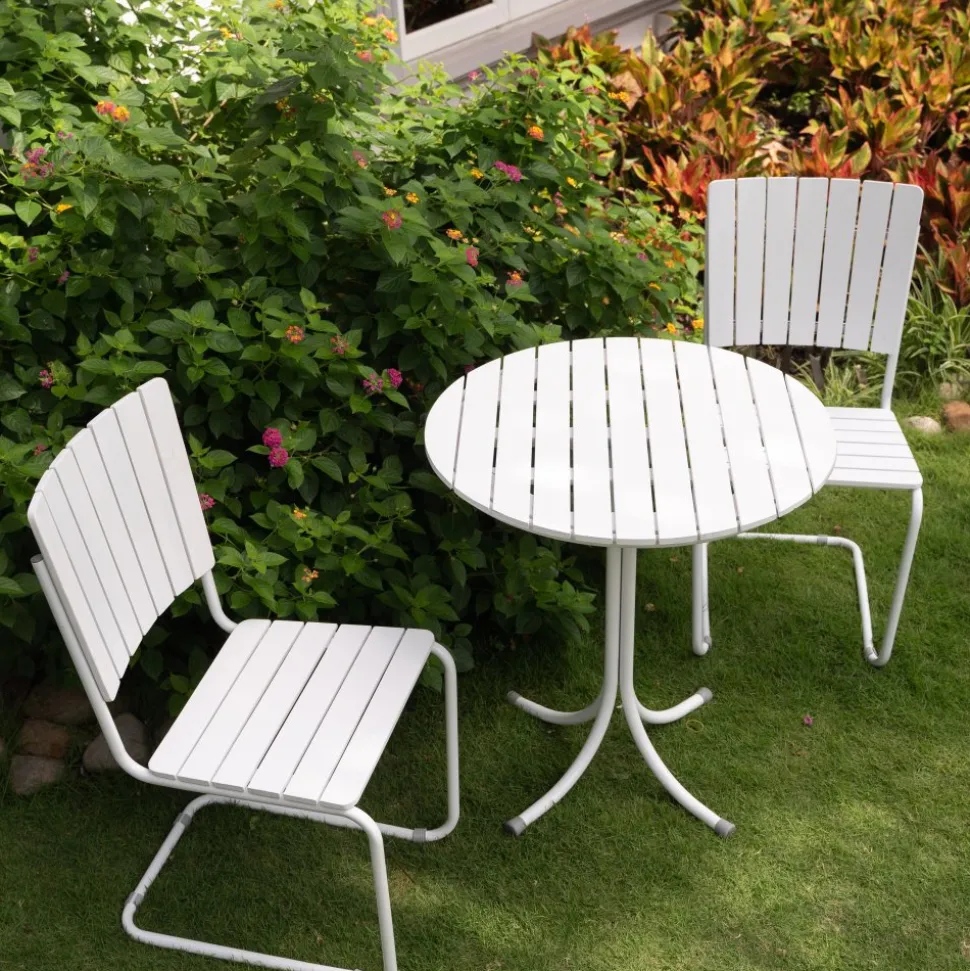 Utegruppen består av ett nätt runt bord Ø70 cm med 2 st tillhörande karmstolar.