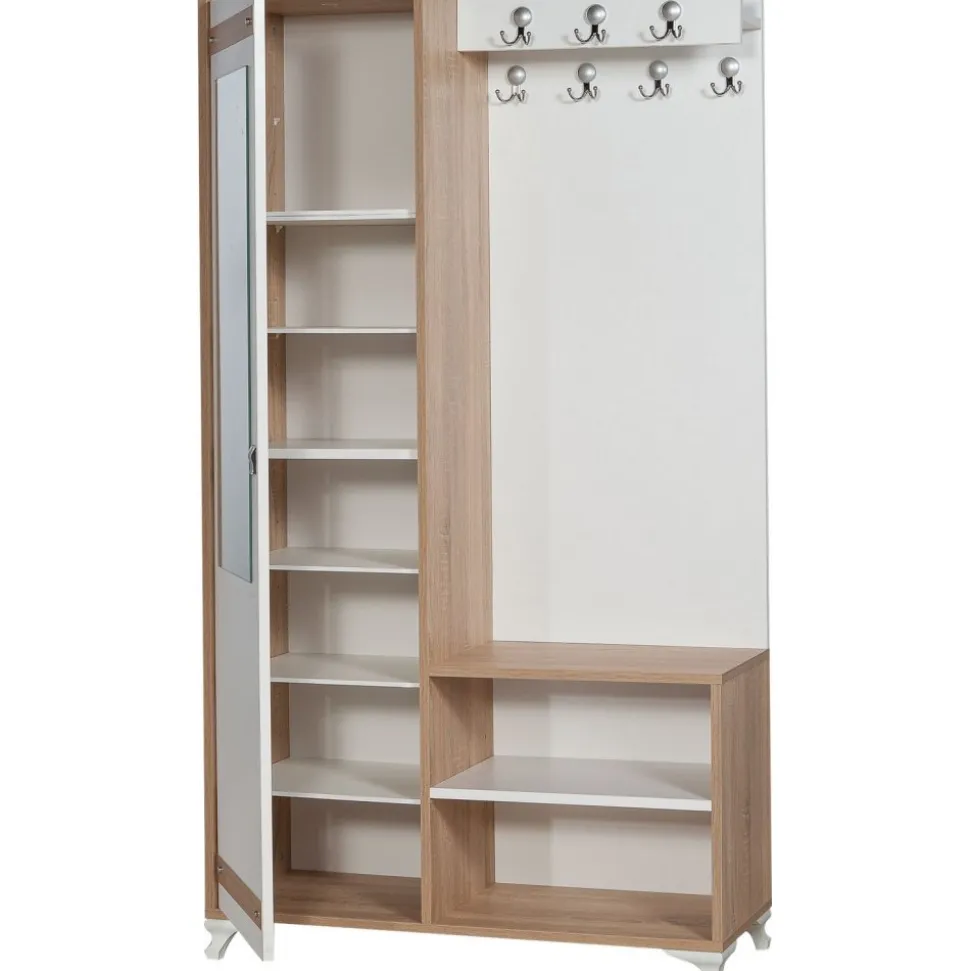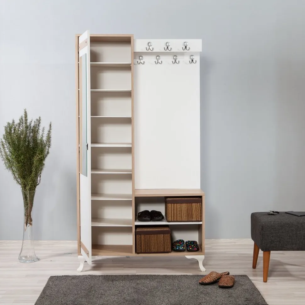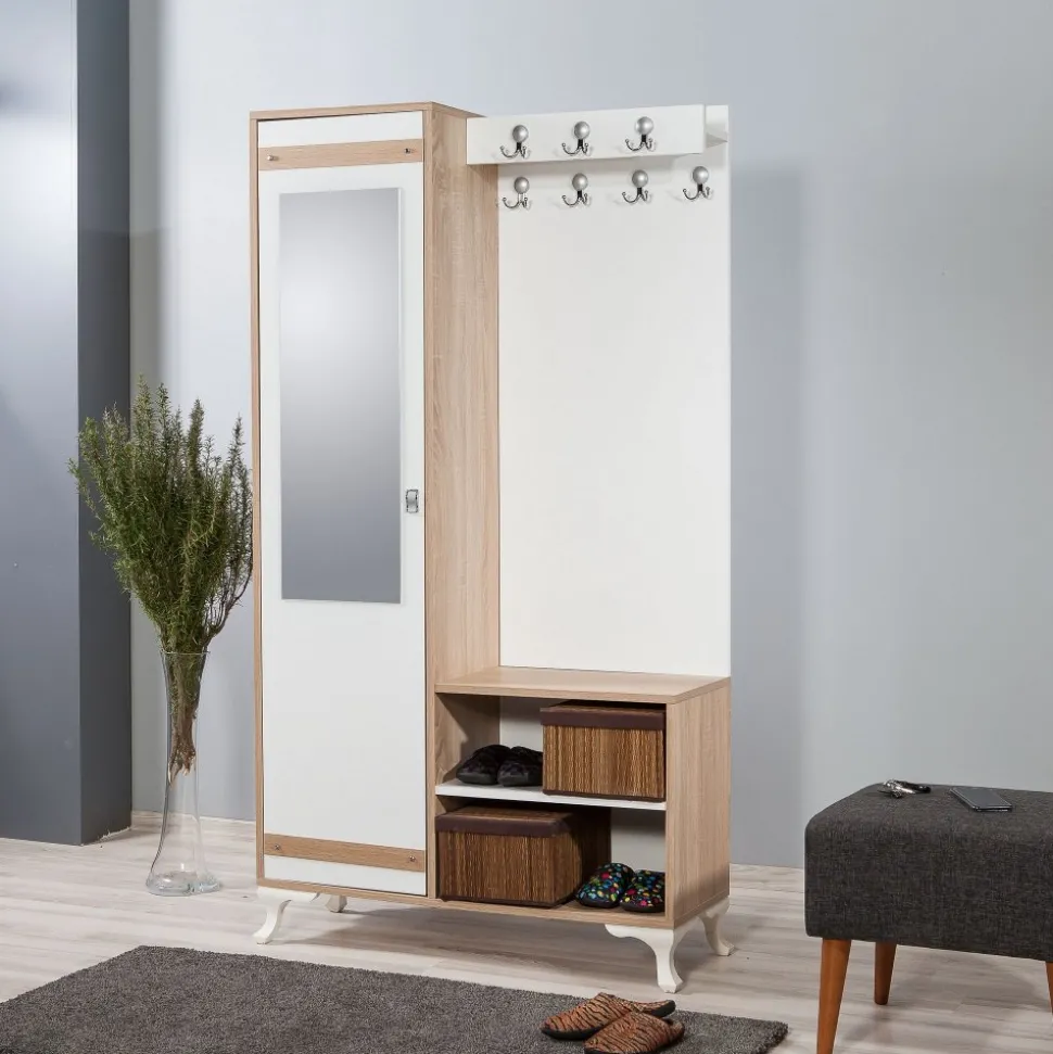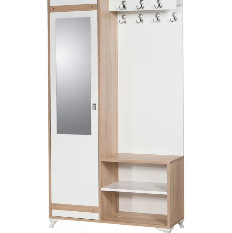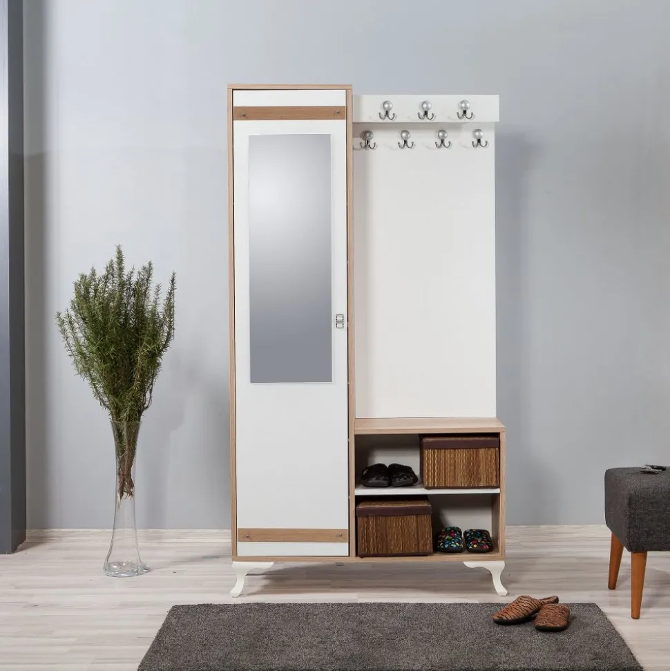 Hallmöbel av melaminbelagd spånskiva. Ben av avenbok. Handtag av metall.