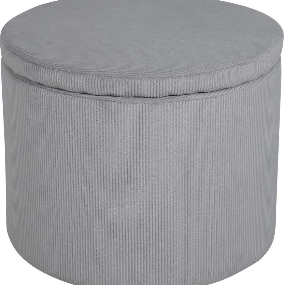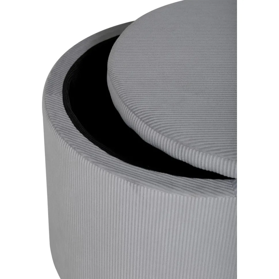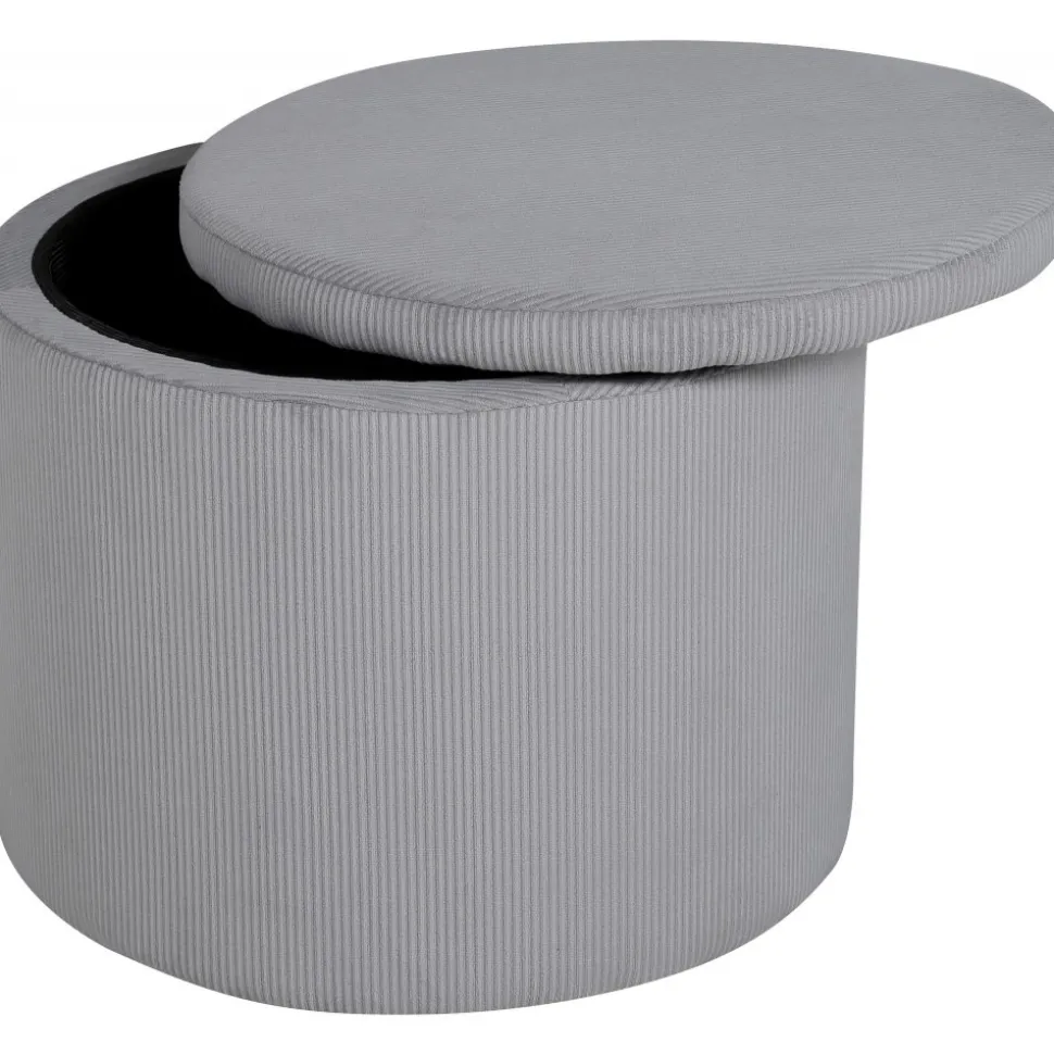 Sittpuff av trä och stål, klädd med polyestertyg.