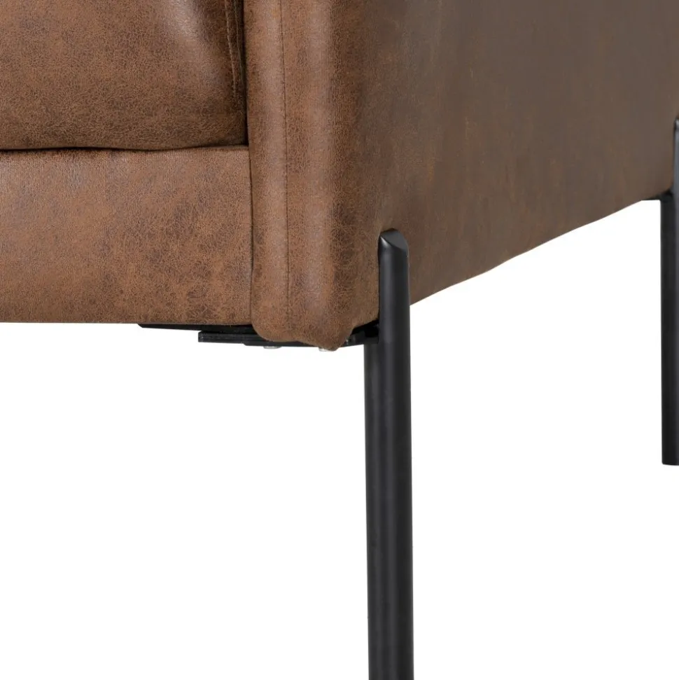 Kingsley är en stilsäker fåtölj med snygga detaljer. Smala höga metallben i svart pulverlackad metall och smala moderna armstöd. Sittdyna med kallskum för bästa sittkomfort och längsta hållbarhet. Klädsel i ett cognacsfärgat ecoläder.