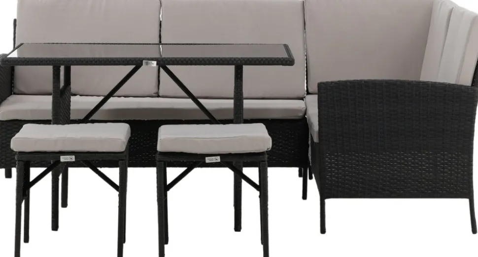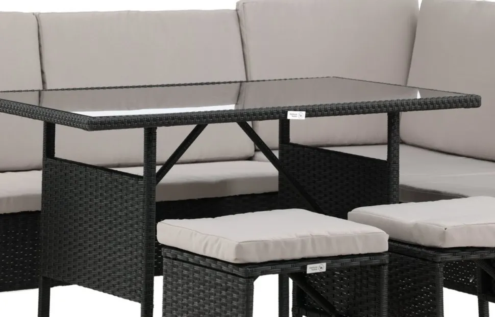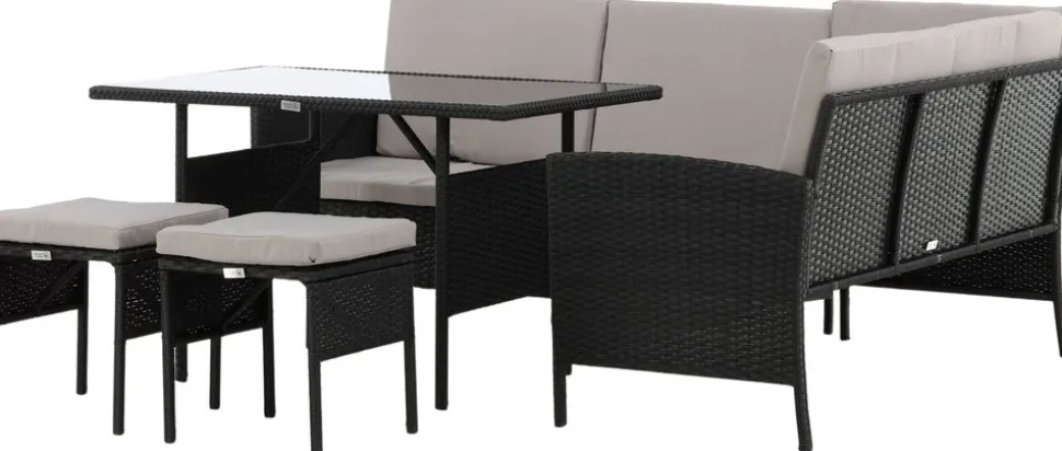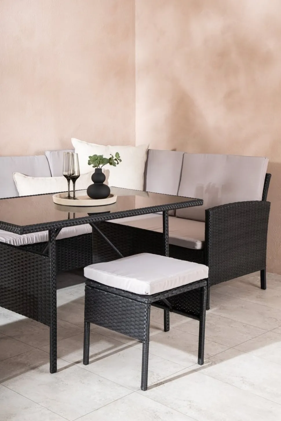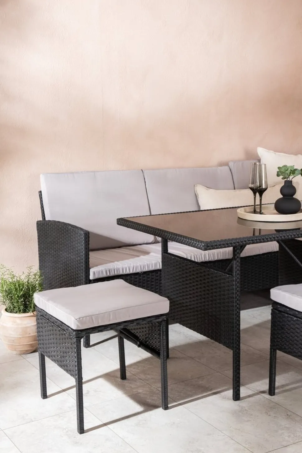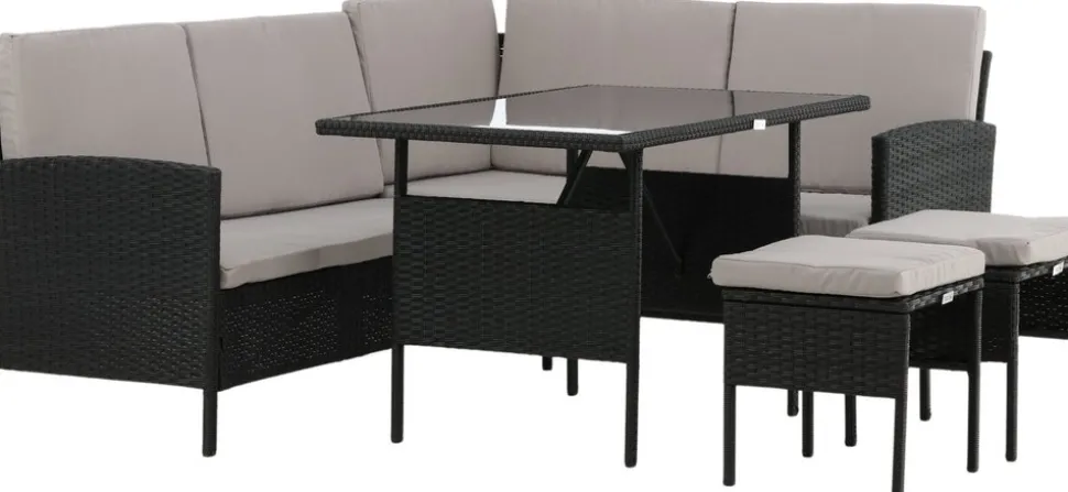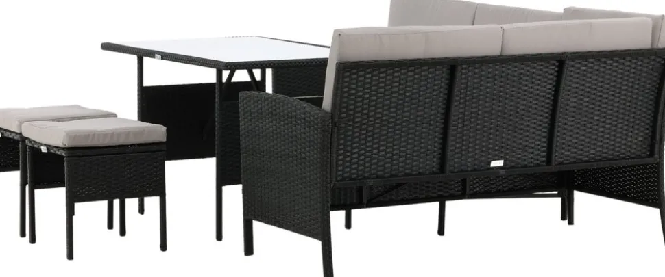 Knock soffgrupp passar utmärkt till din uteplats eller altan och är skapad med fokus på komfort och tidlös deisgn. Soffgruppen består av en hörnsoffa i svart konstrotting med fyra sittplatser och en hörndel, två sittpallar samt ett högre bord i konstrotting med en bordsskiva i glas. Gråa dynor inkluderas till soffgruppen och bidrar till ett inbjudande känsla! Skötselråd: Konstrotting är ett plastmaterial som passar alldeles utmärkt för vårt skandinaviska klimat. Materialet är UV-beständigt och tåler väder och vind. Att det är UV-beständigt gör att möblerna inte bleknas, däremot rekommenderar vi alltid att förvara möblerna under ett möbelskydd eller på annat vis torrt och svalt – för att förlänga livslängden. Se även till att regelbundet rengöra möblerna med milt rengöringsmedel, förslagsvis såpa och vatten, för att hålla damm och smuts borta från fiberväven i materialet.
