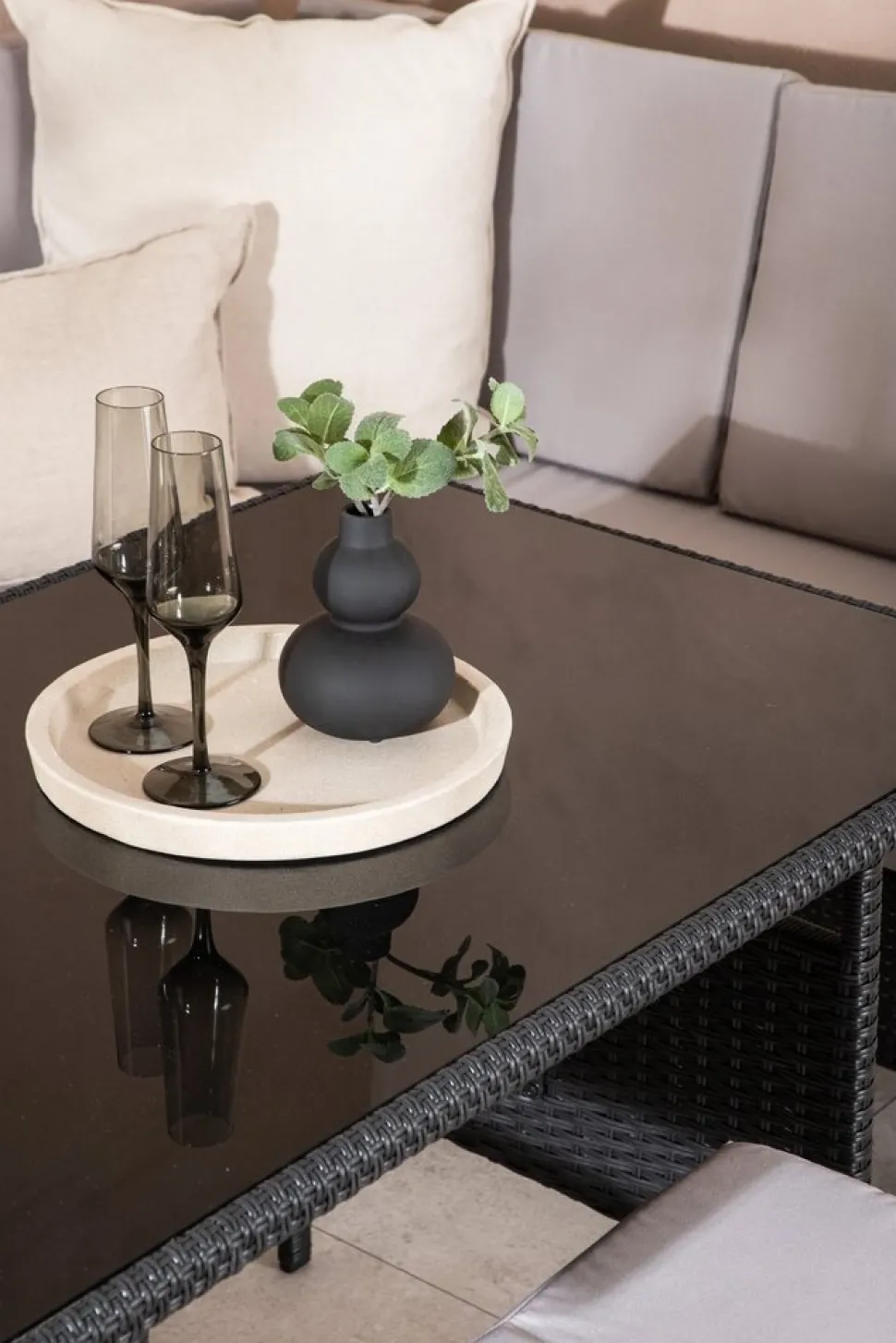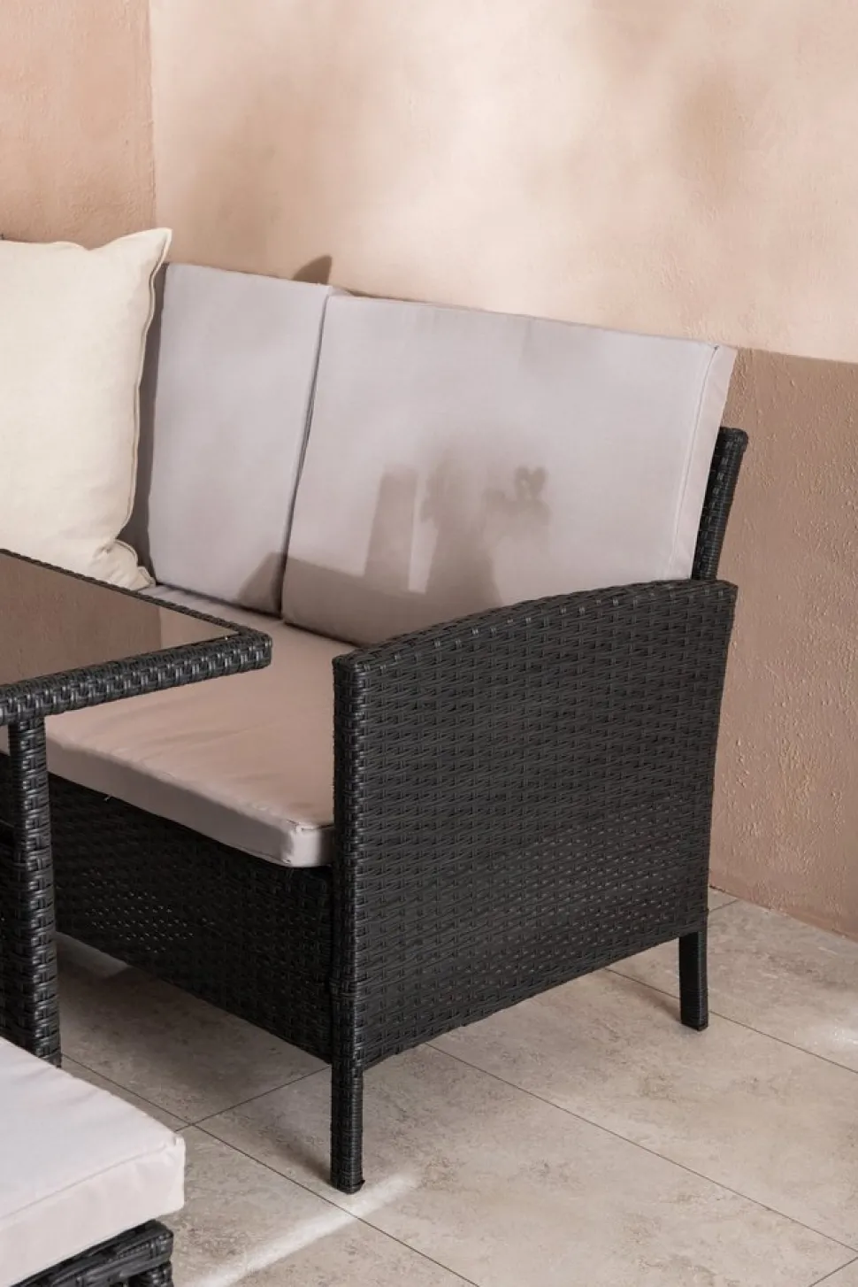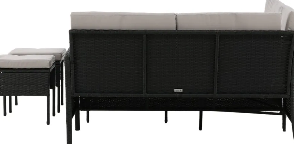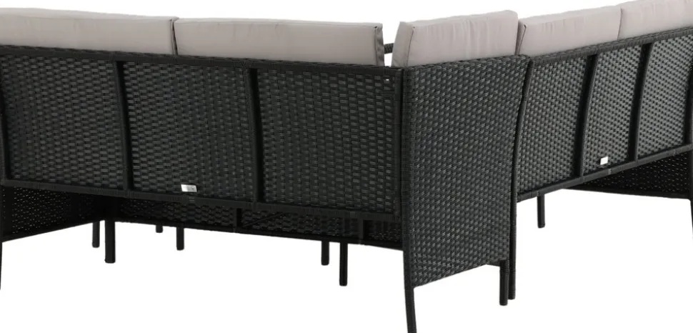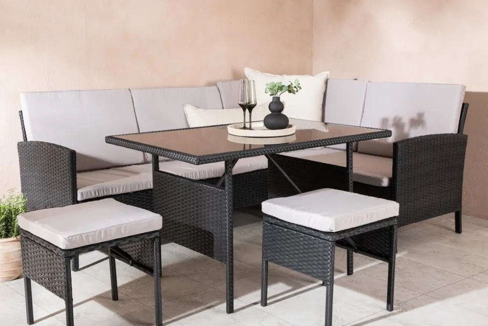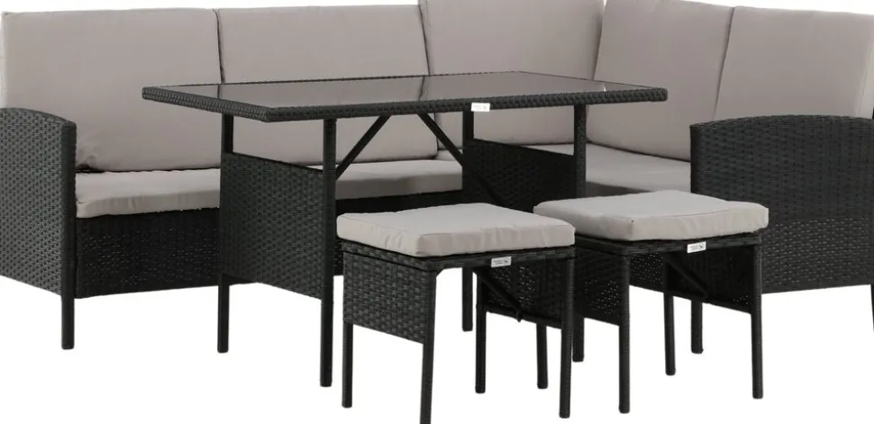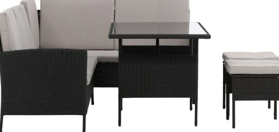 Knock soffgrupp passar utmärkt till din uteplats eller altan och är skapad med fokus på komfort och tidlös deisgn. Soffgruppen består av en hörnsoffa i svart konstrotting med fyra sittplatser och en hörndel, två sittpallar samt ett högre bord i konstrotting med en bordsskiva i glas. Gråa dynor inkluderas till soffgruppen och bidrar till ett inbjudande känsla! Skötselråd: Konstrotting är ett plastmaterial som passar alldeles utmärkt för vårt skandinaviska klimat. Materialet är UV-beständigt och tåler väder och vind. Att det är UV-beständigt gör att möblerna inte bleknas, däremot rekommenderar vi alltid att förvara möblerna under ett möbelskydd eller på annat vis torrt och svalt – för att förlänga livslängden. Se även till att regelbundet rengöra möblerna med milt rengöringsmedel, förslagsvis såpa och vatten, för att hålla damm och smuts borta från fiberväven i materialet.
