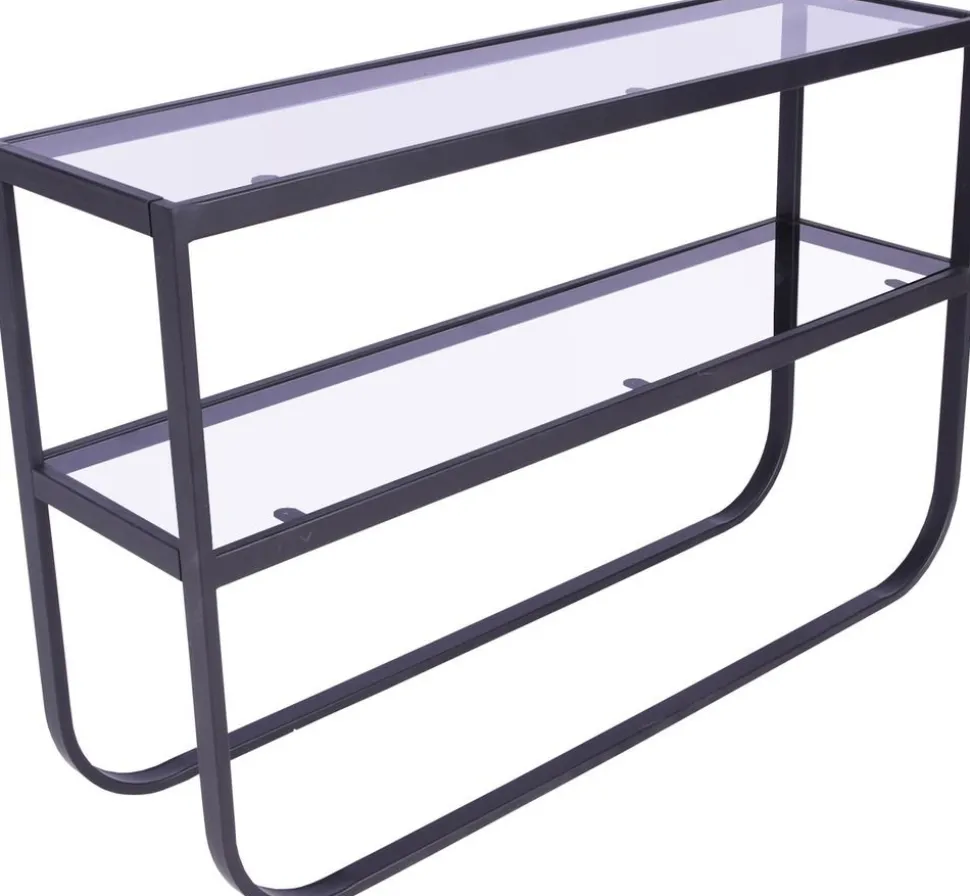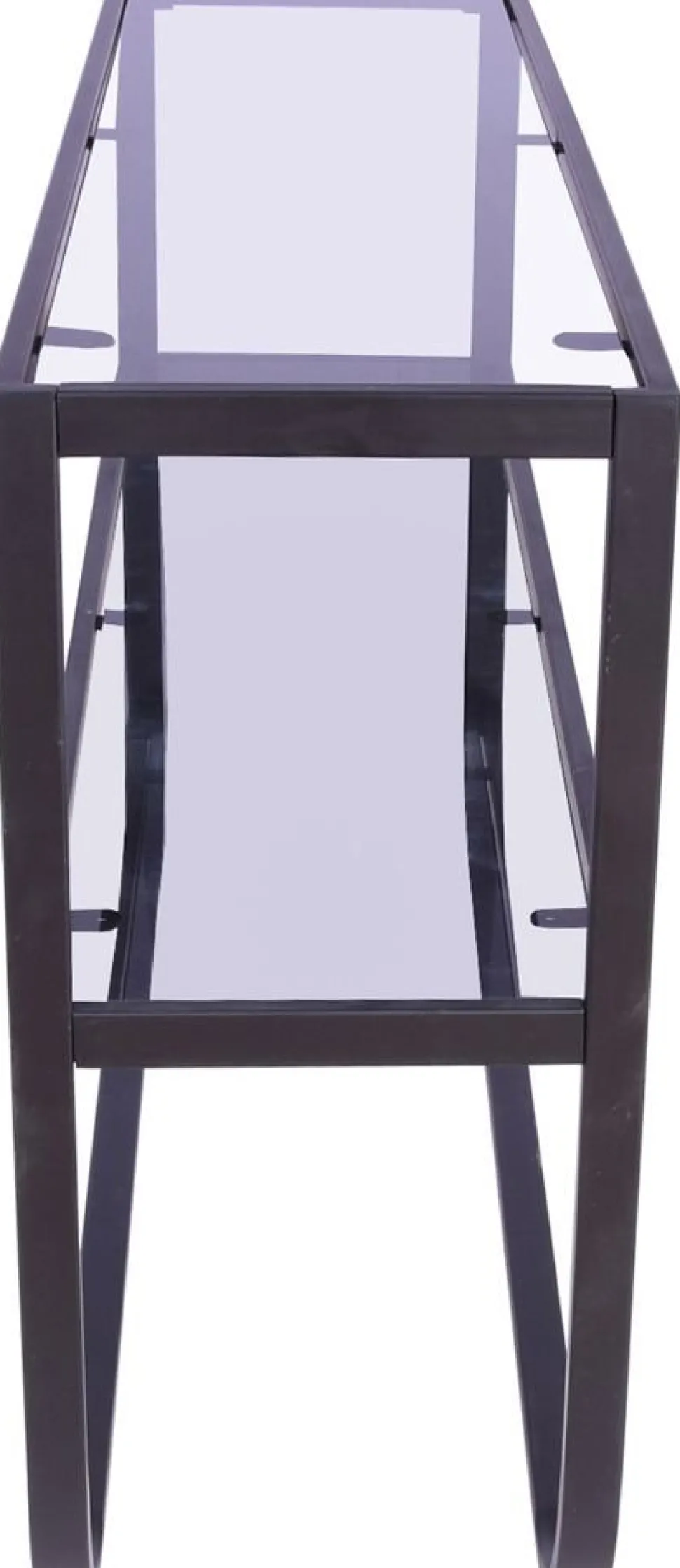 Korsbacken är en serie möbler med metallstomme och toppskivor/hyllplan av färgat glas. Denna variant har en svart stomme.