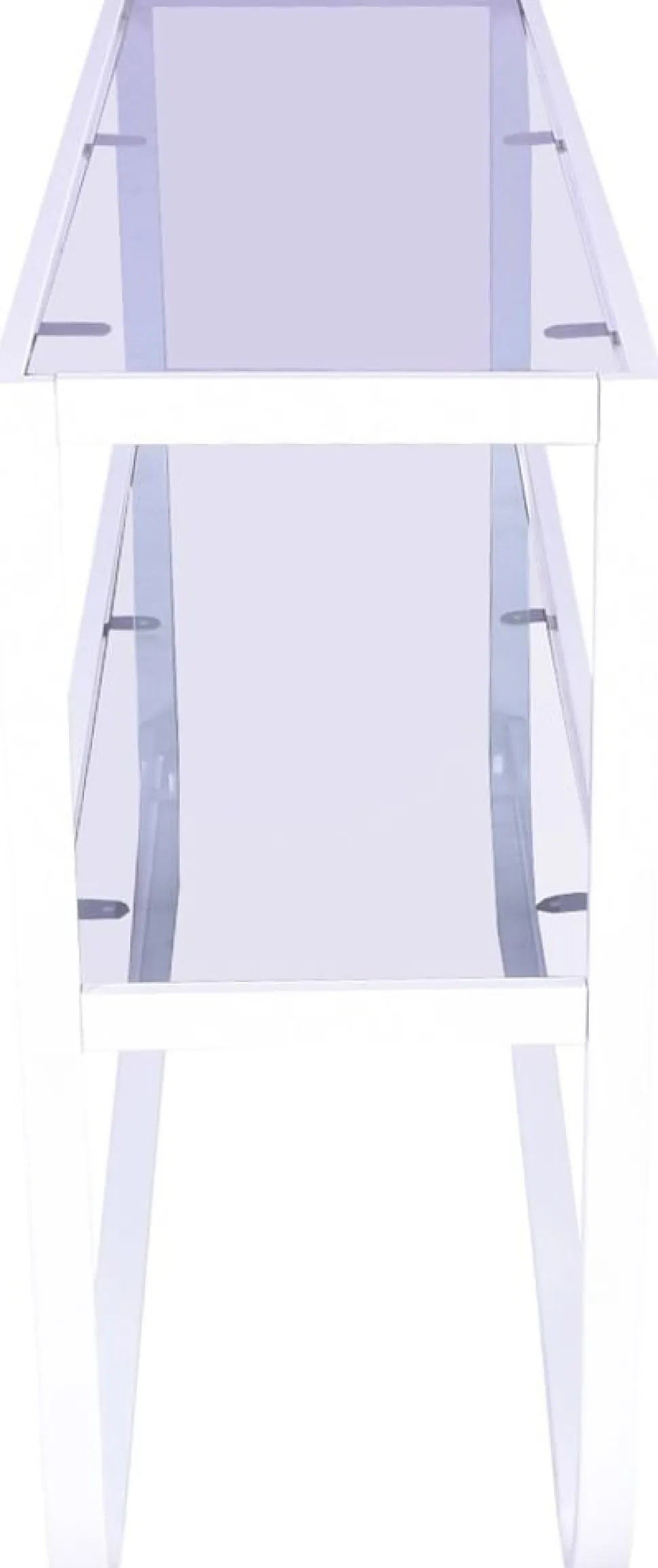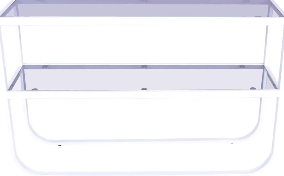 Korsbacken är en serie möbler med metallstomme och toppskivor/hyllplan av färgat glas. Denna variant har en svart stomme och hyllplan av glas färgat i grått.