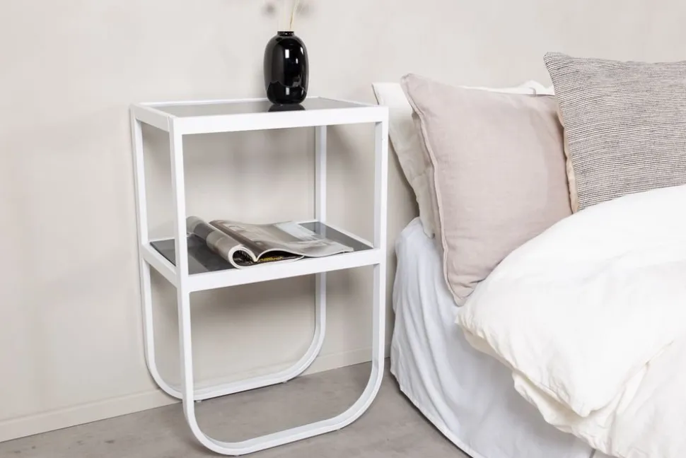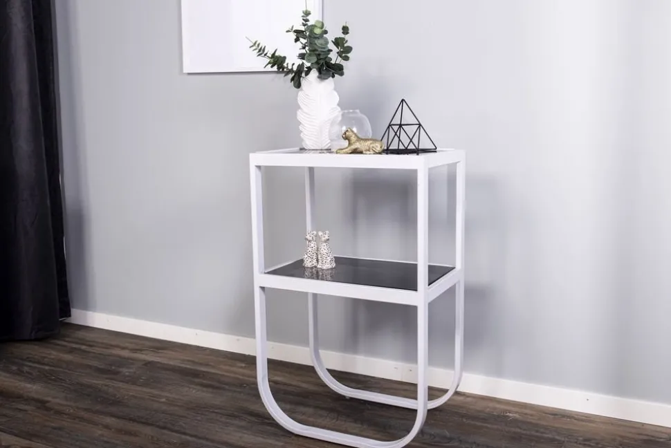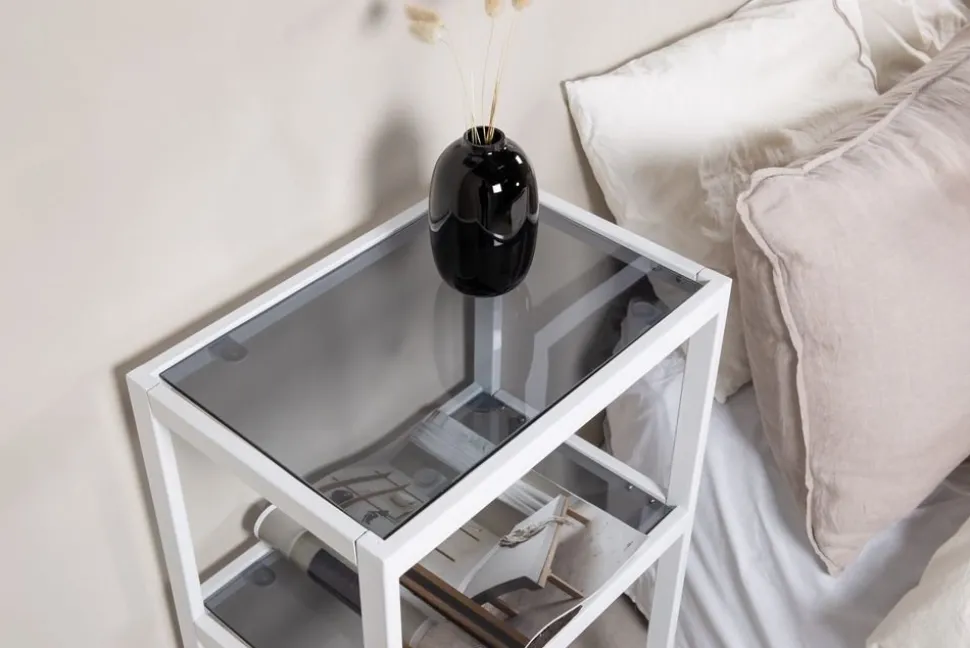 Korsbacken är en serie möbler med metallstomme och toppskivor/hyllplan av färgat glas. Denna variant har en vit stomme och grå skivor av glas.