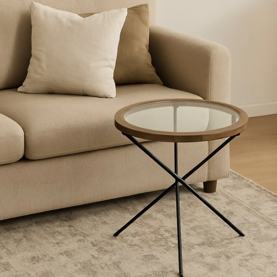 Sea är ett lampbord med svart metallunderrede, toppskiva med träram och glasskiva.