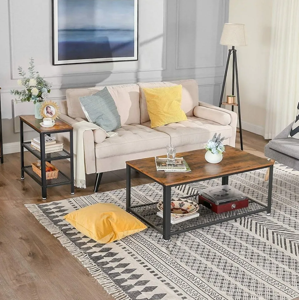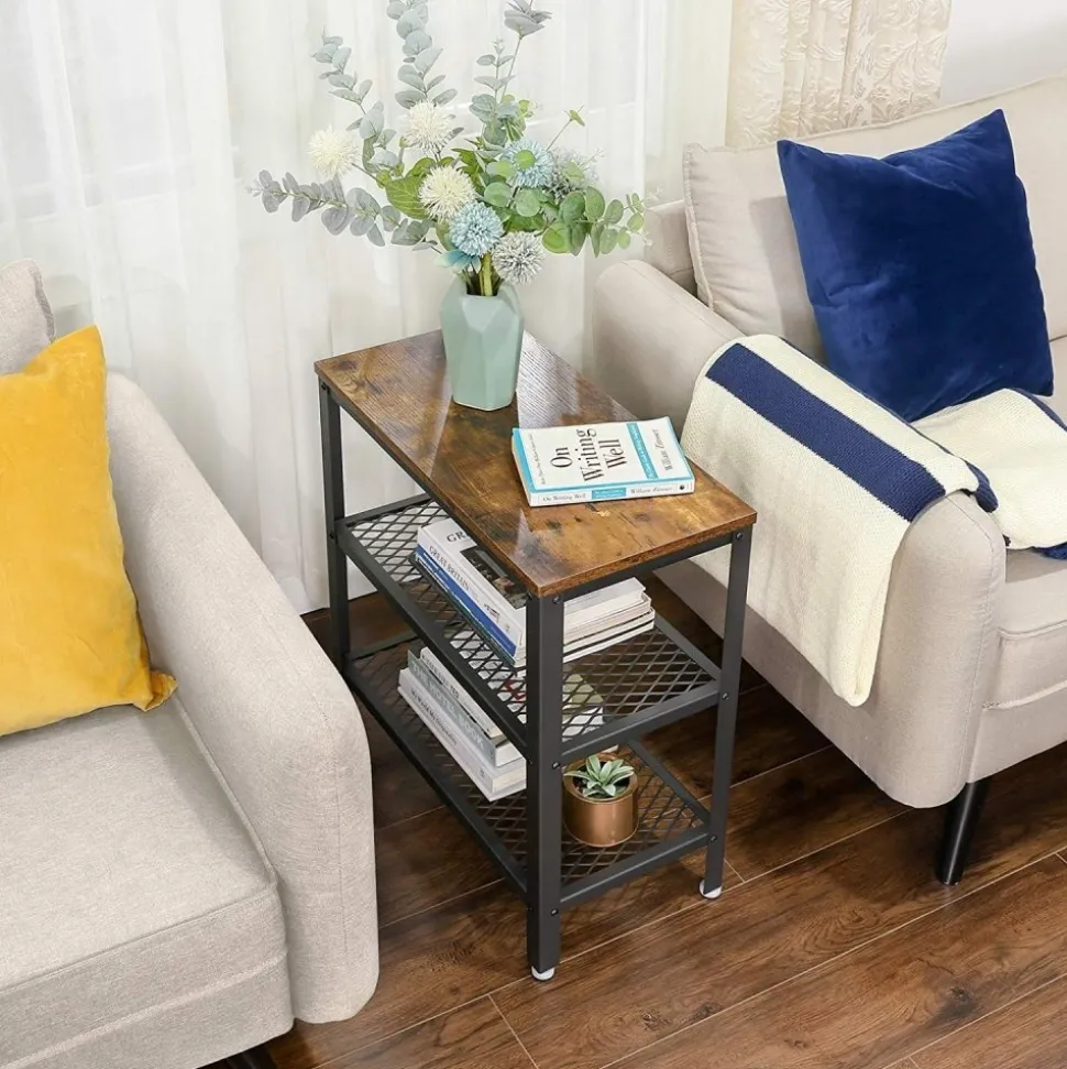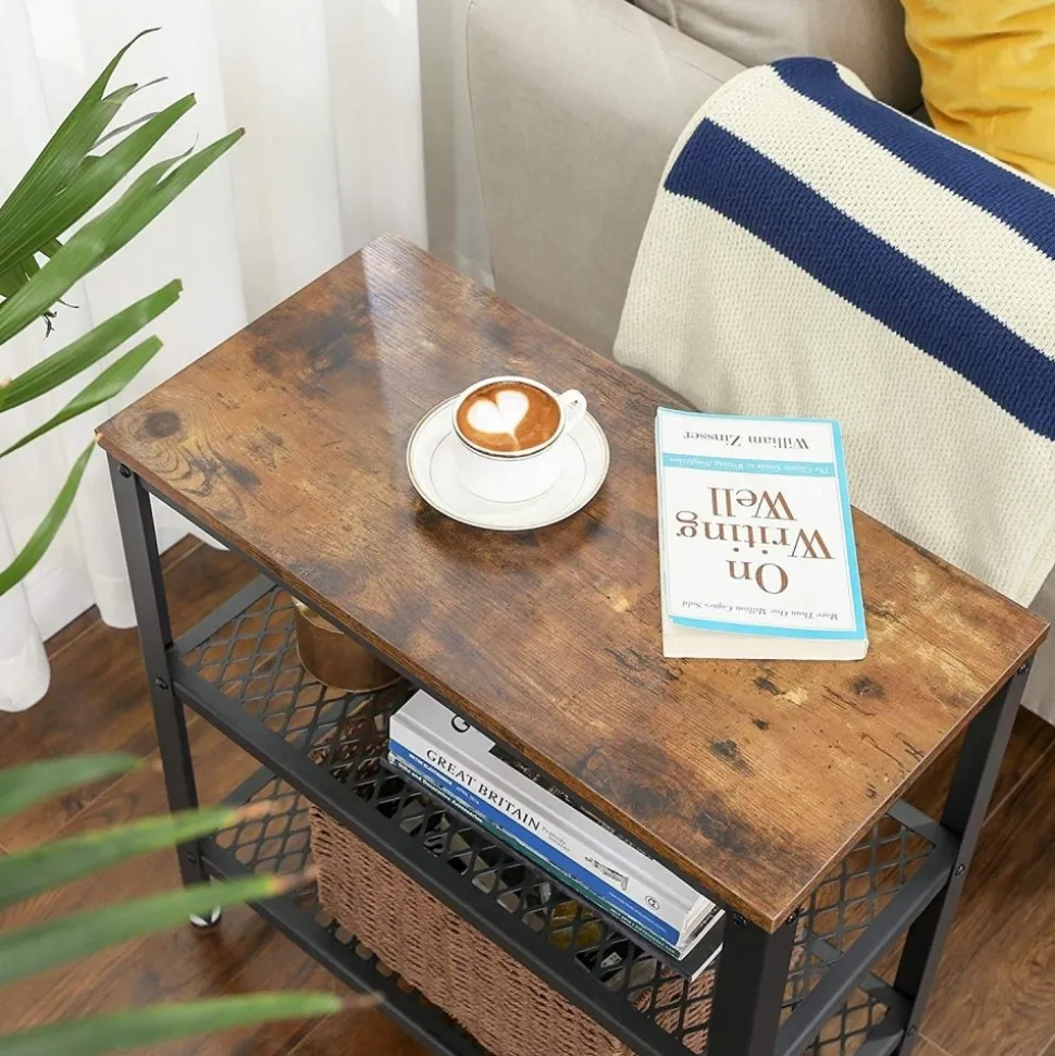 Sidobord av trä och stål.