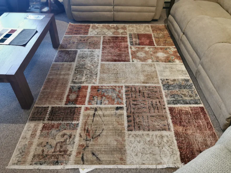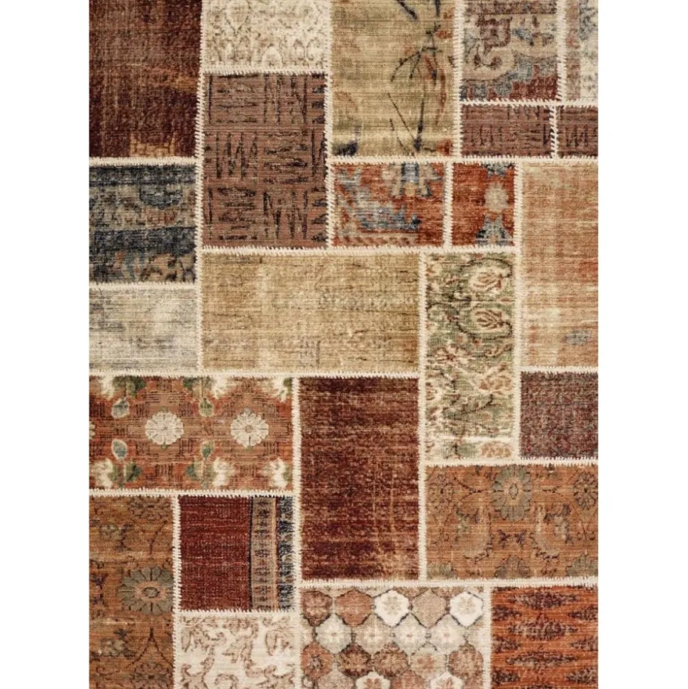 Patchworkmatta med röda, blå, bruna och grå färger kombinerade för ett välkomnande uttryck. Gjord av polypropylen behandlad med heat-set-teknik.
