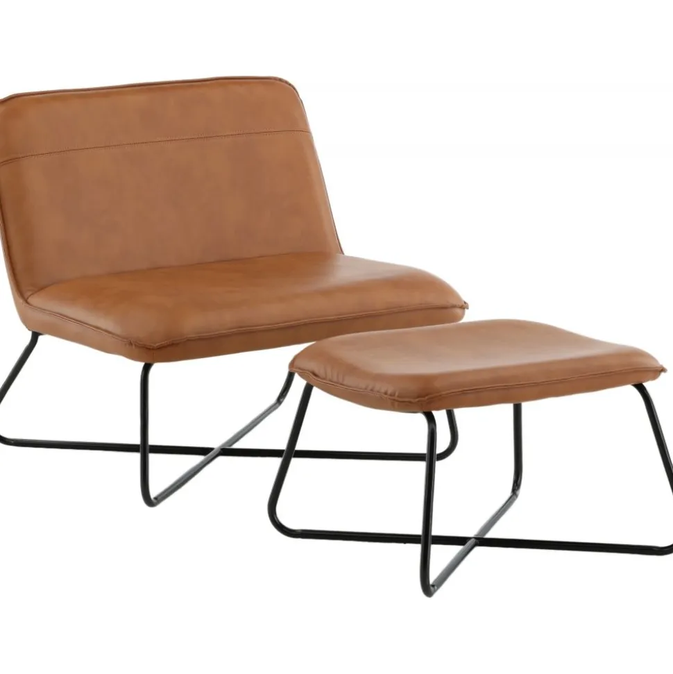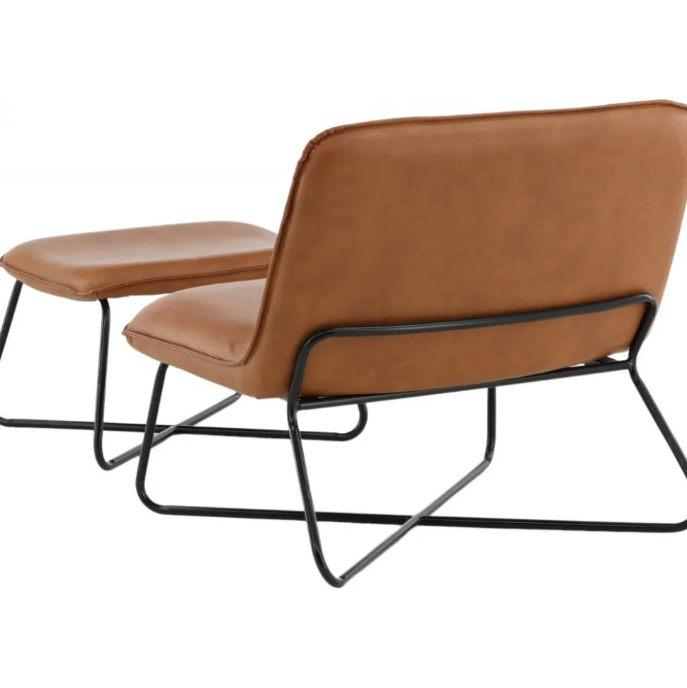 Fåtölj och fotpall av trä och järn, klädd med PU-läder.