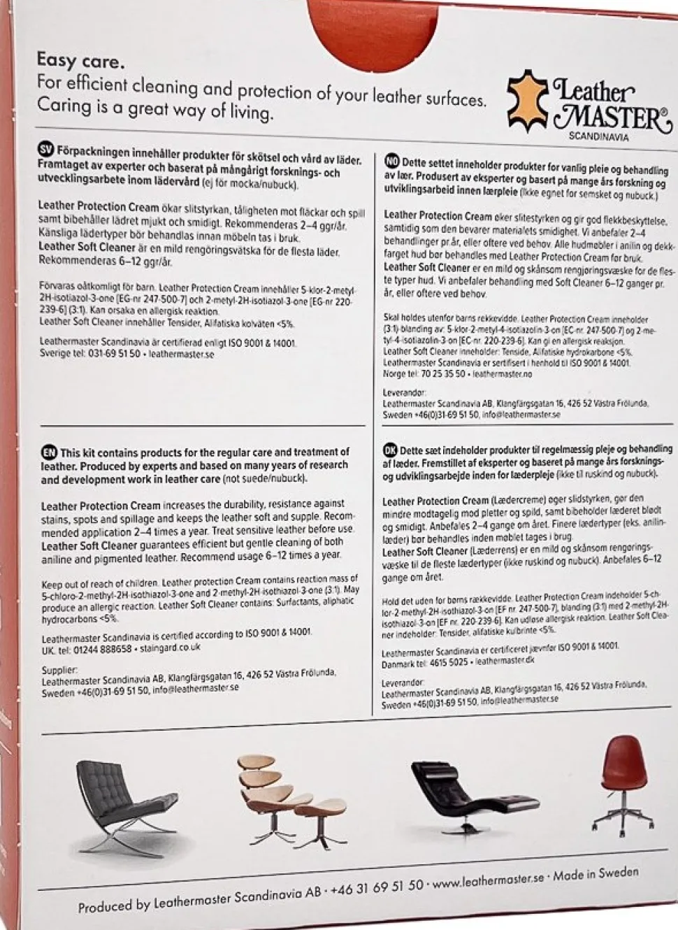 Leather Clean & Protect är ett komplett och beprövat kit för rengöring och skydd av läder, perfekt för regelbunden skötsel av anilin-, semianilin- och täckfärgat läder. Kitet kombinerar mild rengöring med en skyddskräm som hjälper dina lädermöbler att bibehålla sin kvalitet och färg över tid. Finns i två storlekar: Maxi och Mini.