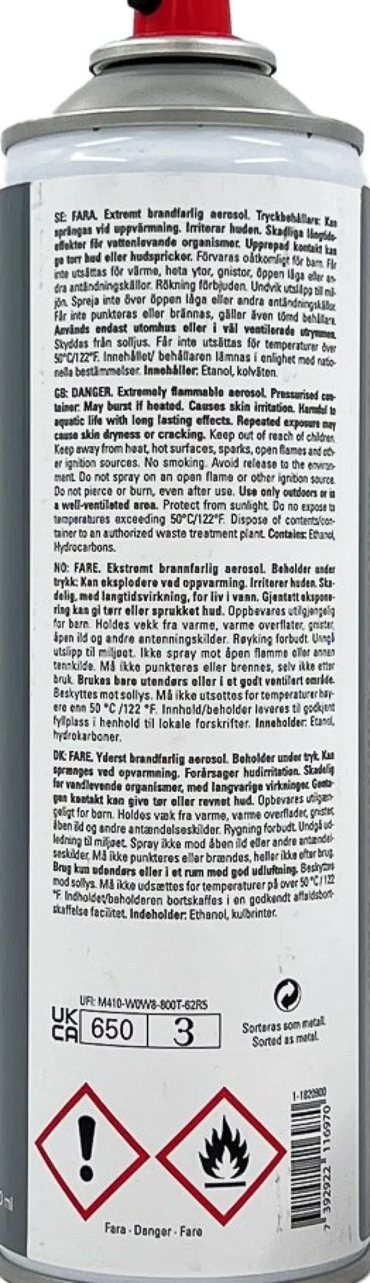 Extremt brandfarlig aerosol. Tryckbehållare: Kan sprängas vid uppvärmning. Skadliga långtidseffekter för vattenlevande organismer. Upprepad kontakt kan ge torr hud eller hudsprickor.