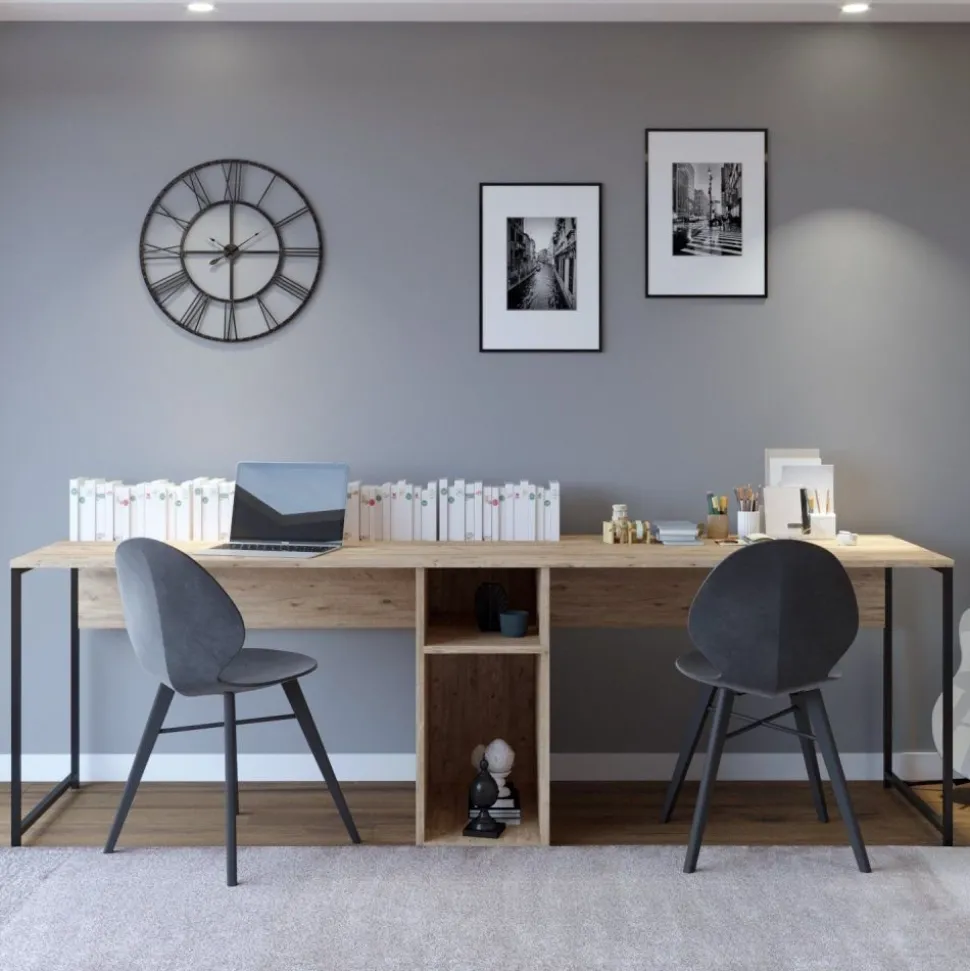 Skrivbord av melaminbelagd spånskiva. Ben av metall.