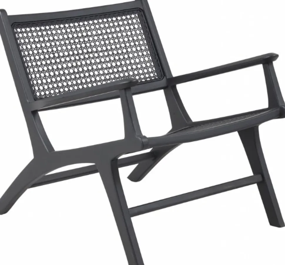 Fåtölj i svart med stomme av teak och sits av svart rotting.