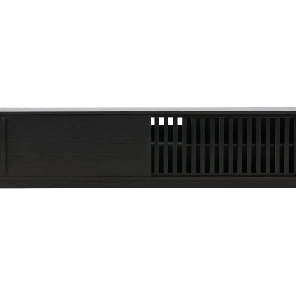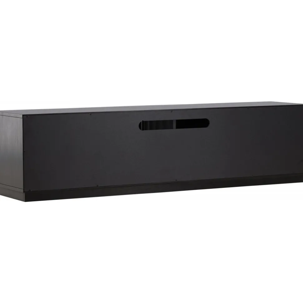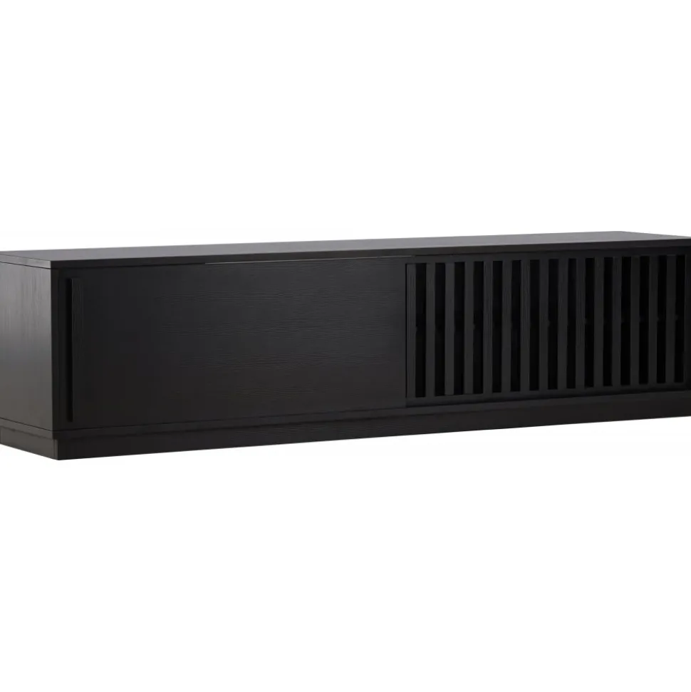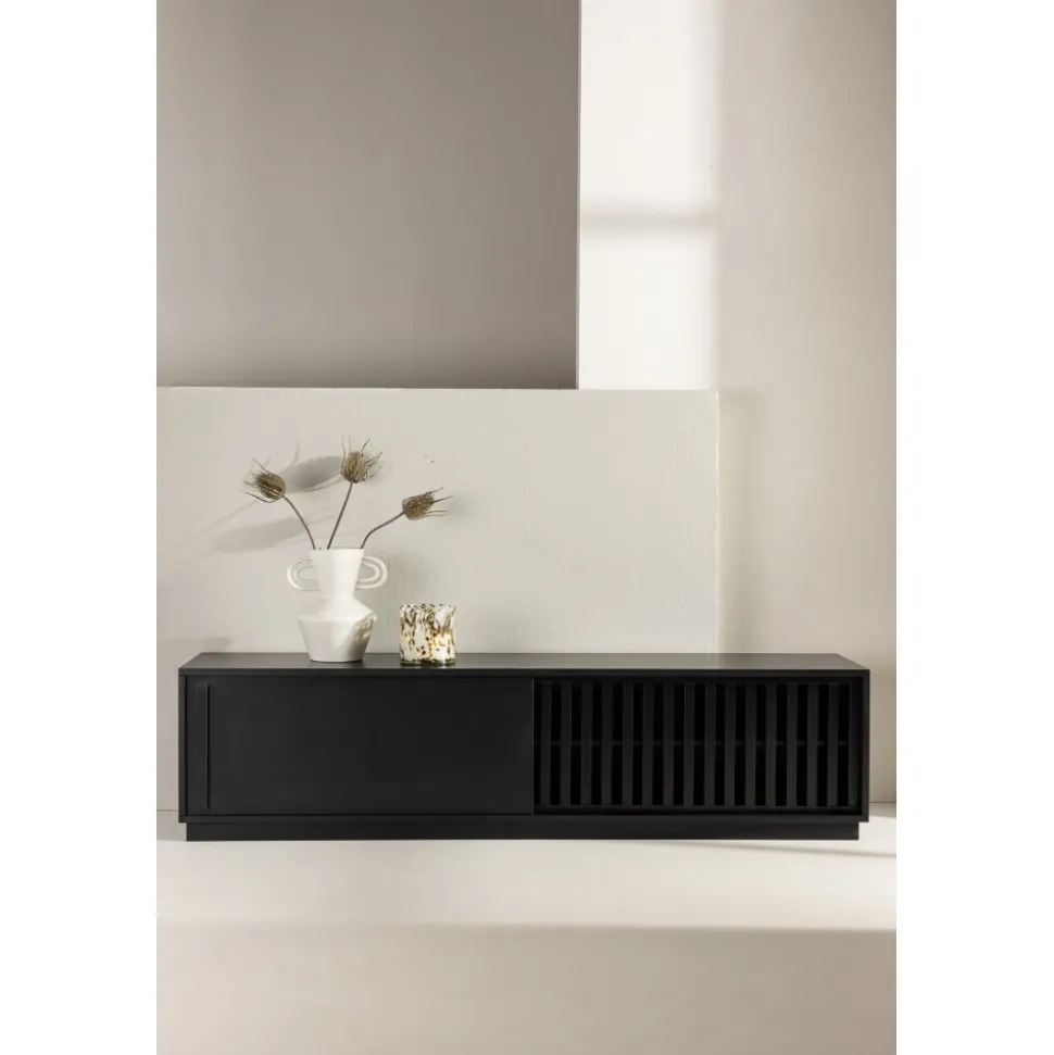 Lugo Tv-bänk i sotig svart kulör är den perfekta kombinationen av funktion och estetik för ditt vardagsrum! Med en slitstark yta av melamin i sotig svart färg skapar den här Tv-bänken både smart förvaring och stilfull design till ditt hem. Den här Tv-bänken ger dig också möjligheten att skräddarsy vilket utseende du önskar ha. Det finns en heltäckande dörr på ena sidan och en modern ribbad gallerdesign på den andra. Den heltäckande skåpsluckan är smart nog justerbar och går att föra över den ribbade ifall du önskar ha en öppen design in mot hyllplanet istället ? bara du bestämmer! Inne på hyllan i Tv-bänken kan du enkelt förvara alla prylar du önskar gömma undan; kablar, fjärrkontroller och annat du inte önskar ha framme. Du kan även välja att dekorera det högra hyllplanet med vackra föremål som du önskar visa upp. Pryd sedan även toppskivan med dina favoritljusstakar och högtalare för att skapa den perfekta atmosfären för din TV-tittarupplevelse. Det ska kännas mysigt att komma hem till Tv-hörnan! Levereras omonterad.