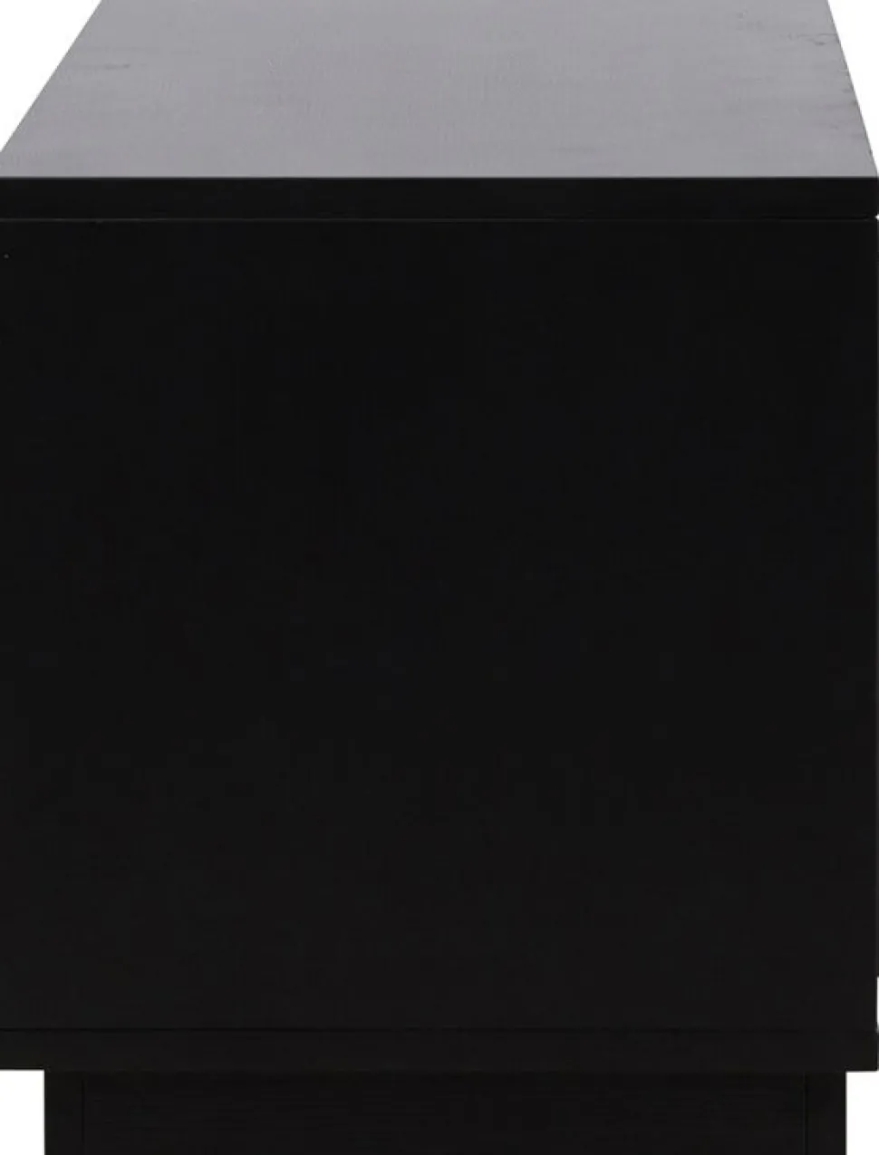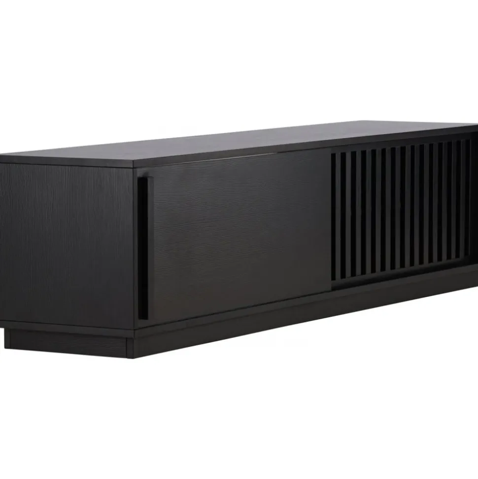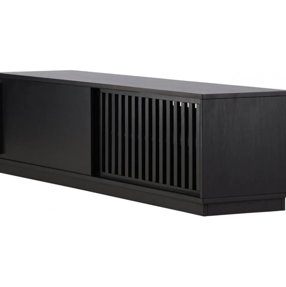 Lugo Tv-bänk i sotig svart kulör är den perfekta kombinationen av funktion och estetik för ditt vardagsrum! Med en slitstark yta av melamin i sotig svart färg skapar den här Tv-bänken både smart förvaring och stilfull design till ditt hem. Den här Tv-bänken ger dig också möjligheten att skräddarsy vilket utseende du önskar ha. Det finns en heltäckande dörr på ena sidan och en modern ribbad gallerdesign på den andra. Den heltäckande skåpsluckan är smart nog justerbar och går att föra över den ribbade ifall du önskar ha en öppen design in mot hyllplanet istället ? bara du bestämmer! Inne på hyllan i Tv-bänken kan du enkelt förvara alla prylar du önskar gömma undan; kablar, fjärrkontroller och annat du inte önskar ha framme. Du kan även välja att dekorera det högra hyllplanet med vackra föremål som du önskar visa upp. Pryd sedan även toppskivan med dina favoritljusstakar och högtalare för att skapa den perfekta atmosfären för din TV-tittarupplevelse. Det ska kännas mysigt att komma hem till Tv-hörnan! Levereras omonterad.