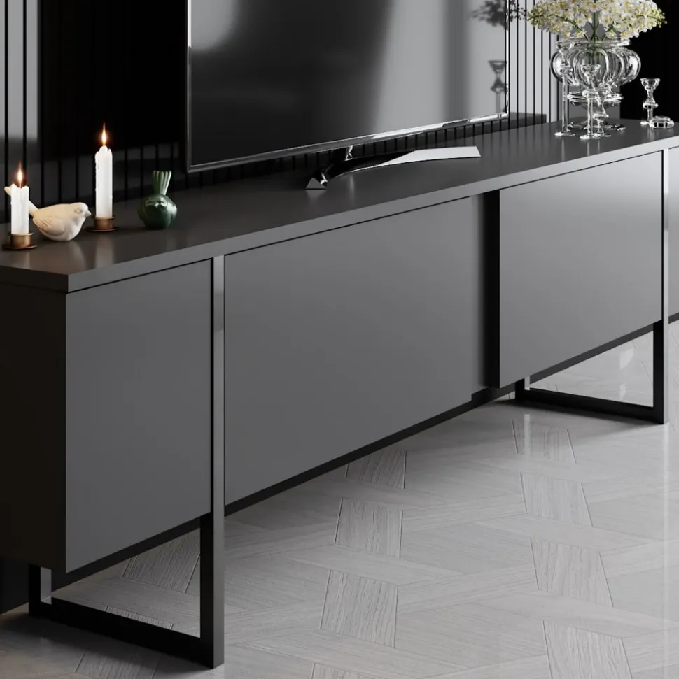 Mediabänk av trä med ben av metall.