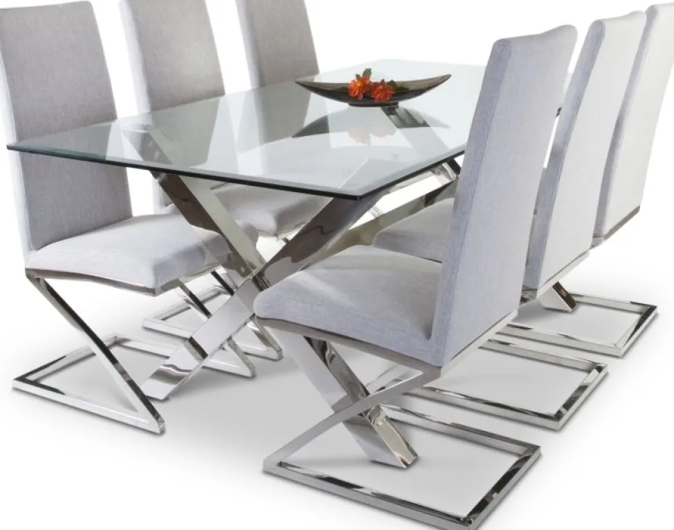 Elegant med glasskiva, ben och ram i metall. Obs, stolar ingår ej.