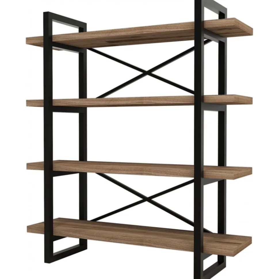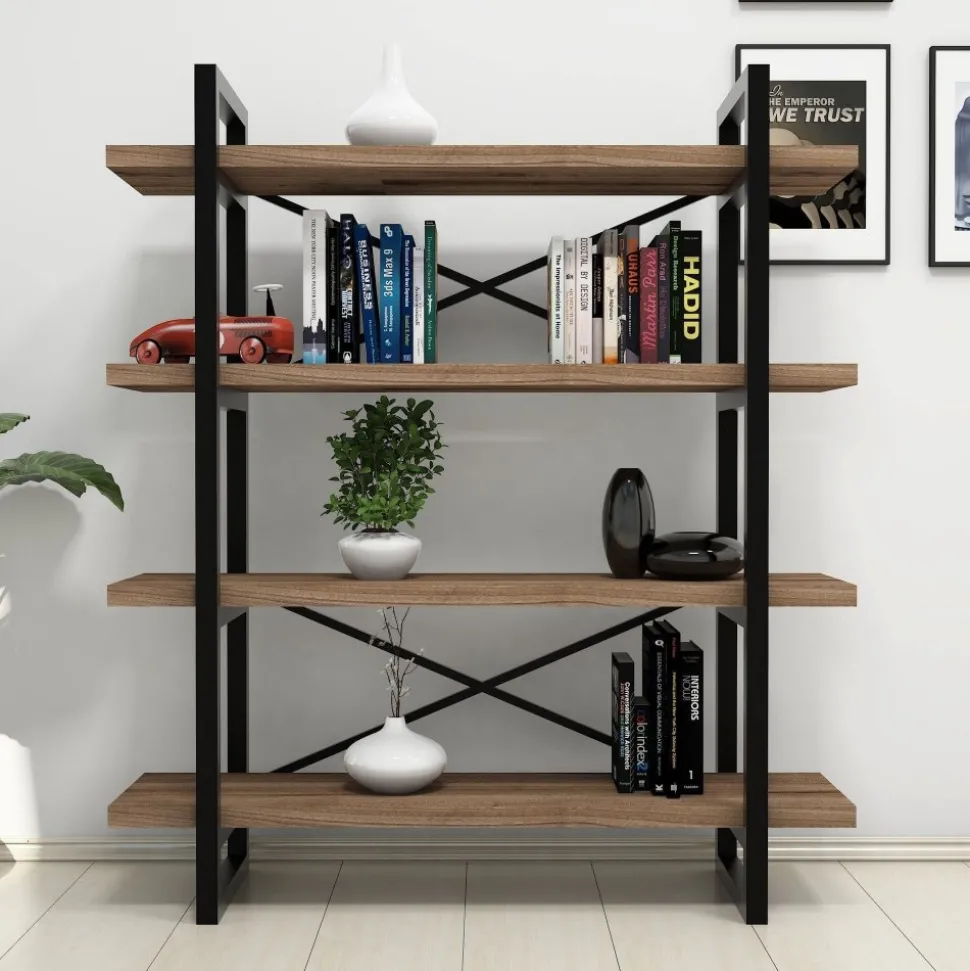 Bokhylla av trä och metall.