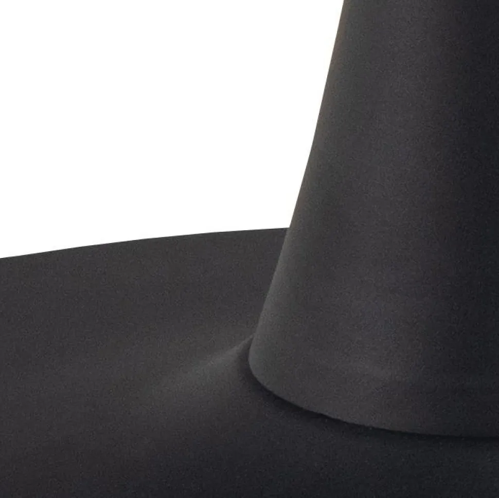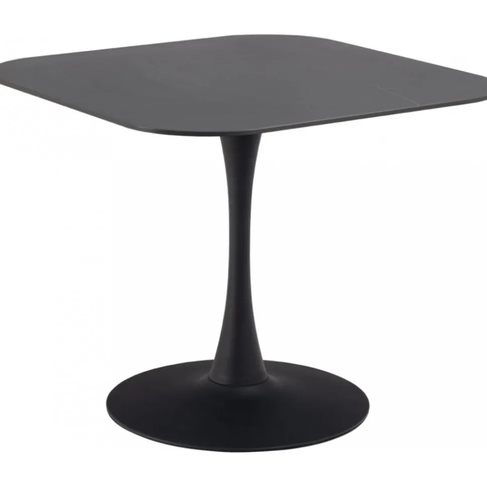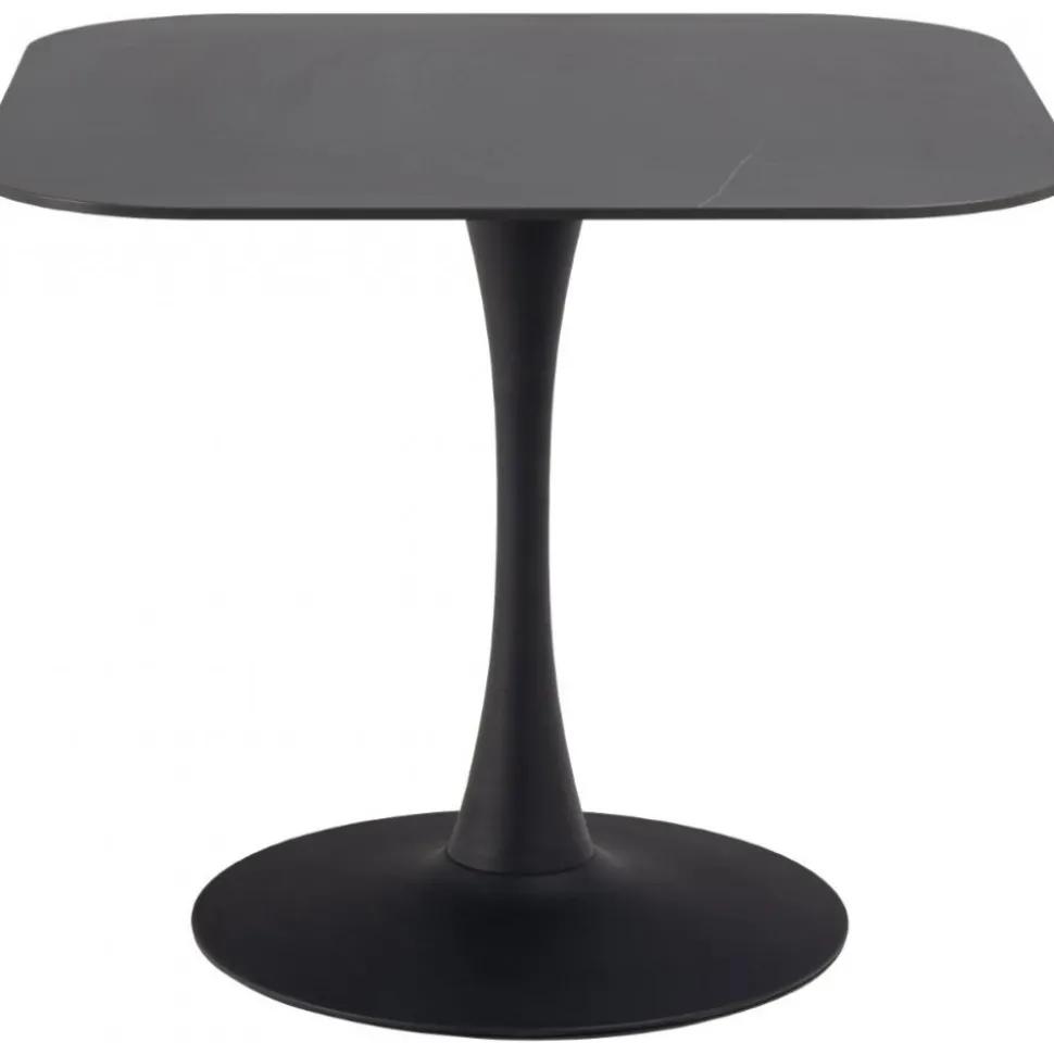 Matbord med bordsskiva av keramik och underrede av pulverlackerad stål. Bordsskivan är både värmebeständig och reptålig.