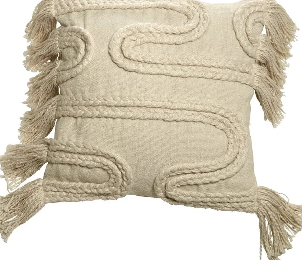 Snyggt med påsydda rep som slutar i tofsar på olika ställen på sidorna. Enfärgad baksida.