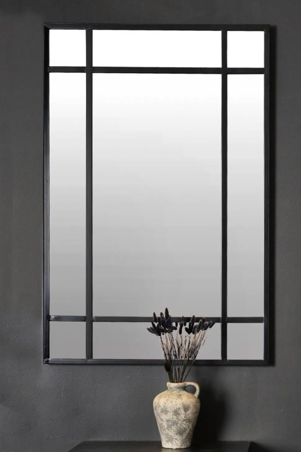 Spegel med metallram i antiksvart, dekorerad med profil i samma färg och struktur som ramen.