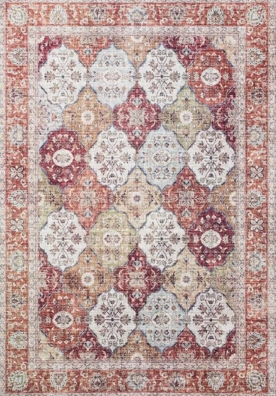 Cleo Colourful är en elegant som har vackert mönster med orientalisk inspiration. Mattan har en melerad roströd bottenfärg med tryckt mönster i röda och blå toner. Mattans kanter pryds utav en sydd langettering som består av riktiga stygn i röd ton, vilket ger en exklusiv och lyxig känsla.