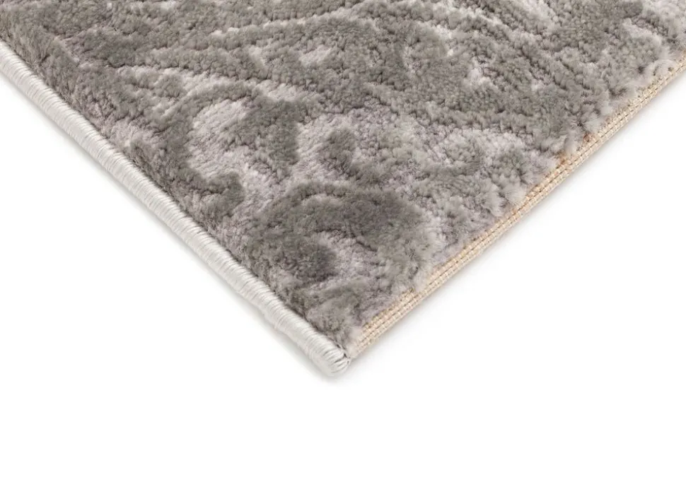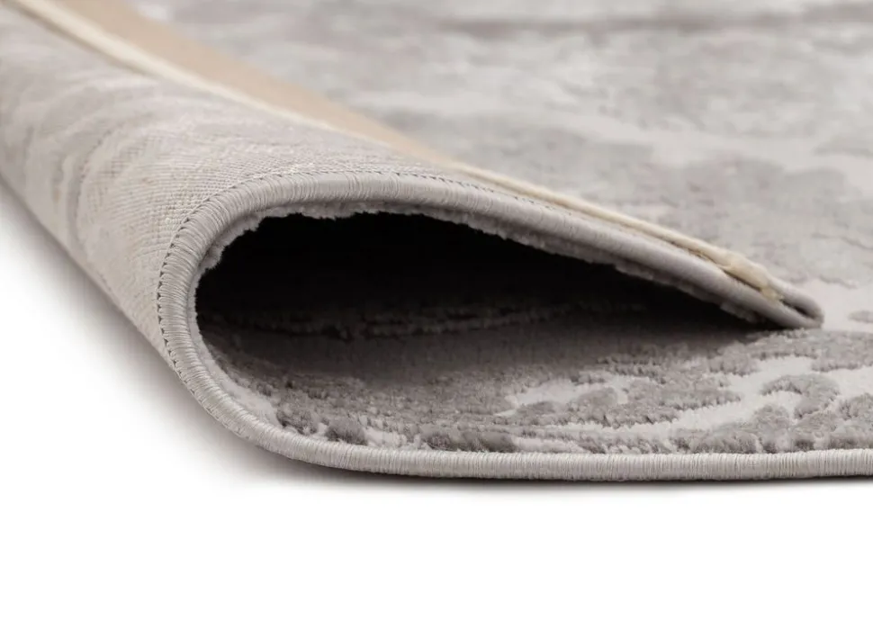 Galya Medaljong har en ljusgrå bottenfärg och pryds av ett medaljongmönster i grå toner som skiftar i ljusstyrka. Mattan har en ljusgrå langettering på långsidorna och kortsidorna är förstärkta med lim, som gör mattan extra tålig.
