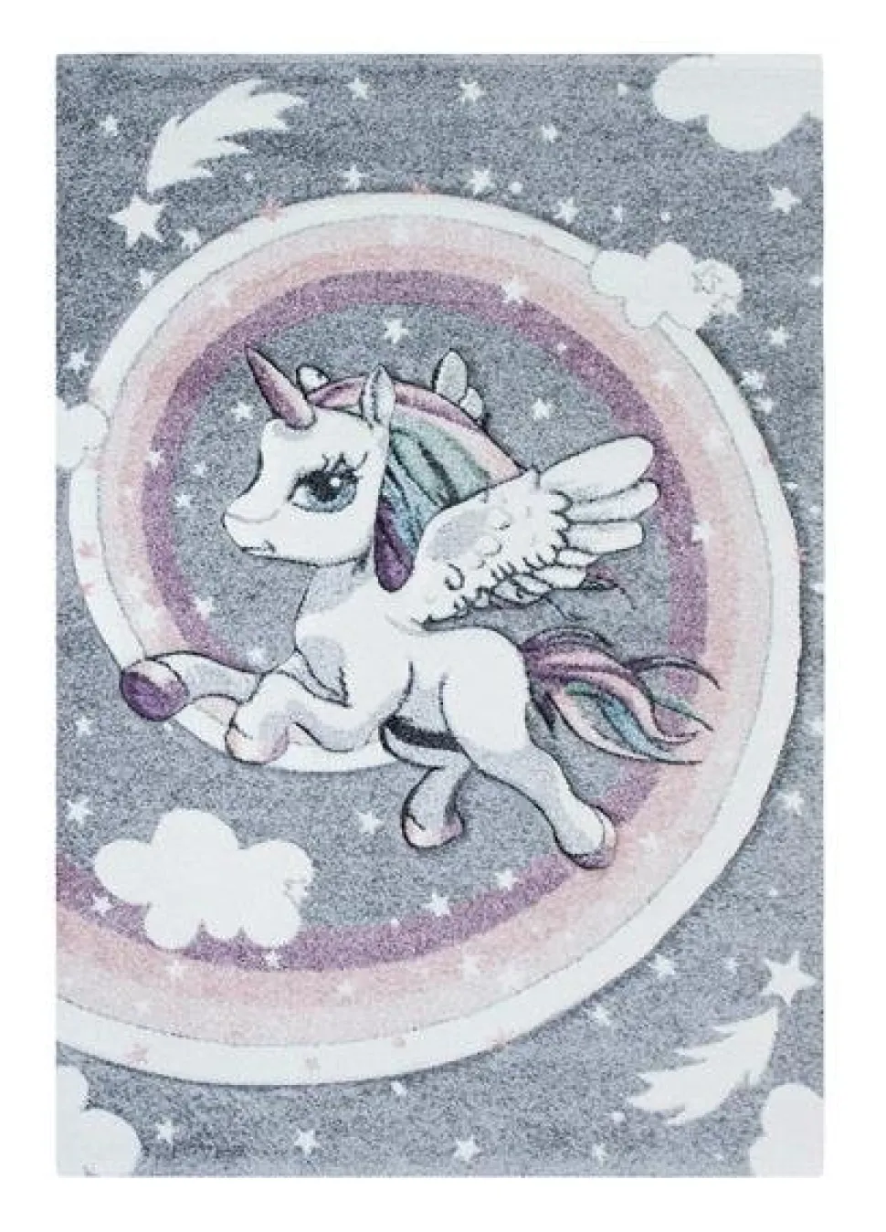 Jermaine är en maskinvävd matta som har grå bottenfärg och matchande langettering. Mattan pryds av en vit enhörning som har vita vingar och pastellfärgad man och svans. Enhörningen omges av vita stjärnor och moln.