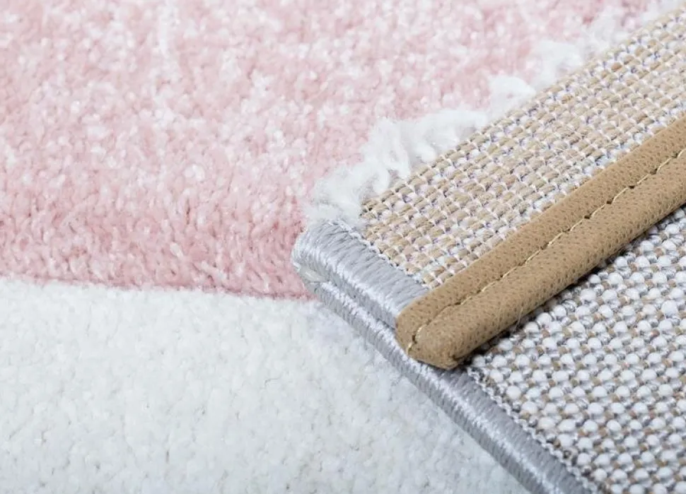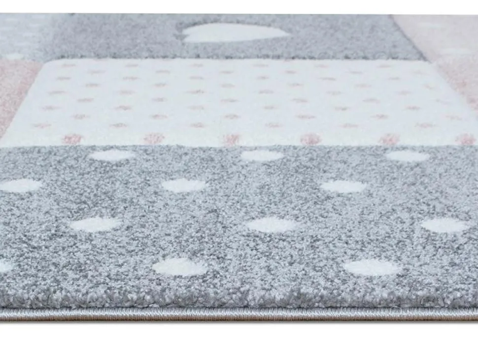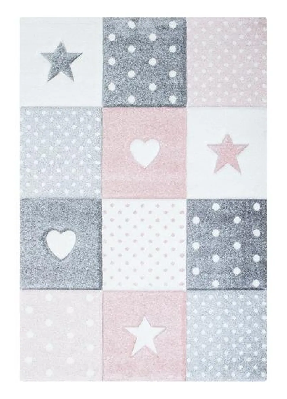 Octavia är en maskinvävd matta som kommer i vita, grå och rosa toner. Mattan har en grå langettering på långsidorna och pryds av ett rutmönster med stjärnor och hjärtan.