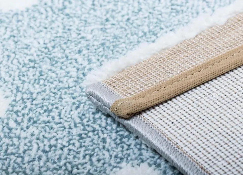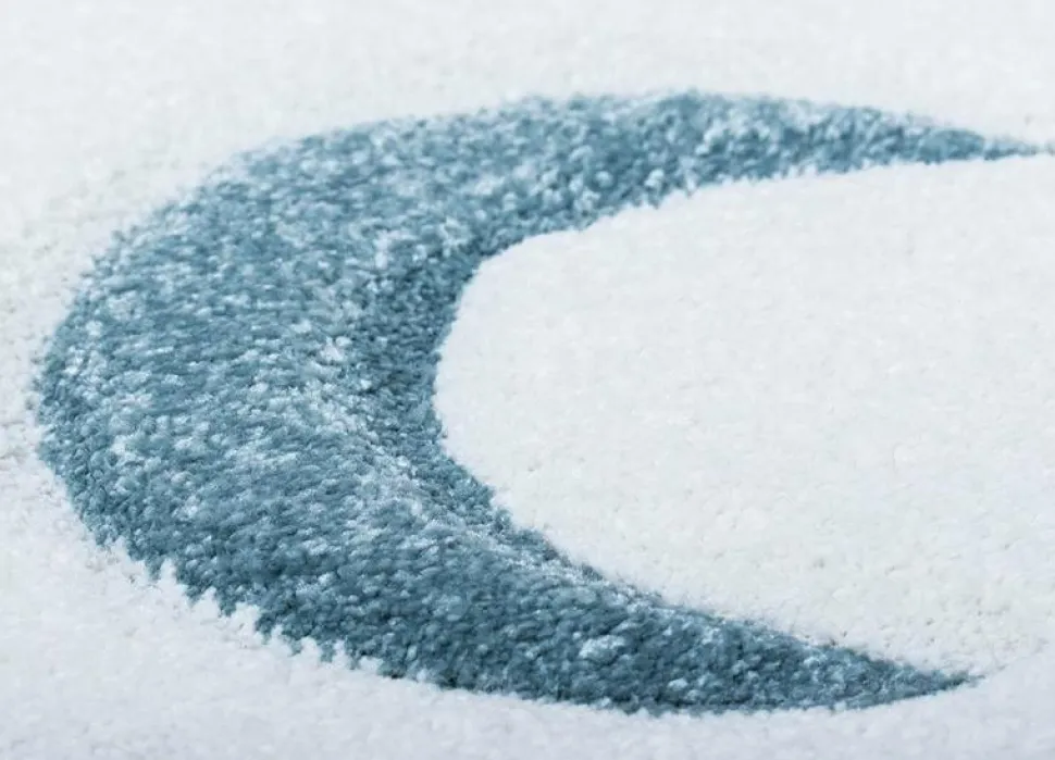 Octavia är en maskinvävd matta som kommer i vita, grå och turkosa toner. Mattan har en grå langettering på långsidorna och pryds av ett rutmönster med stjärnor och halvmånar.