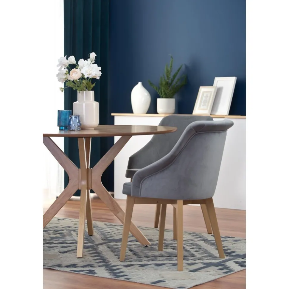 Stilrent, runt i massivt trä. Toppskivan på matbordet är av fanèrad ek. Matbordet är 120 cm i diameter, och har generöst med plats för dukning.