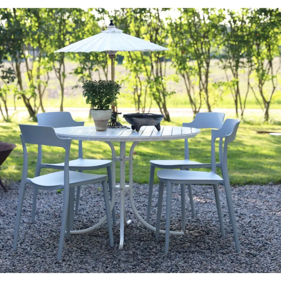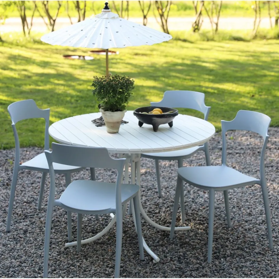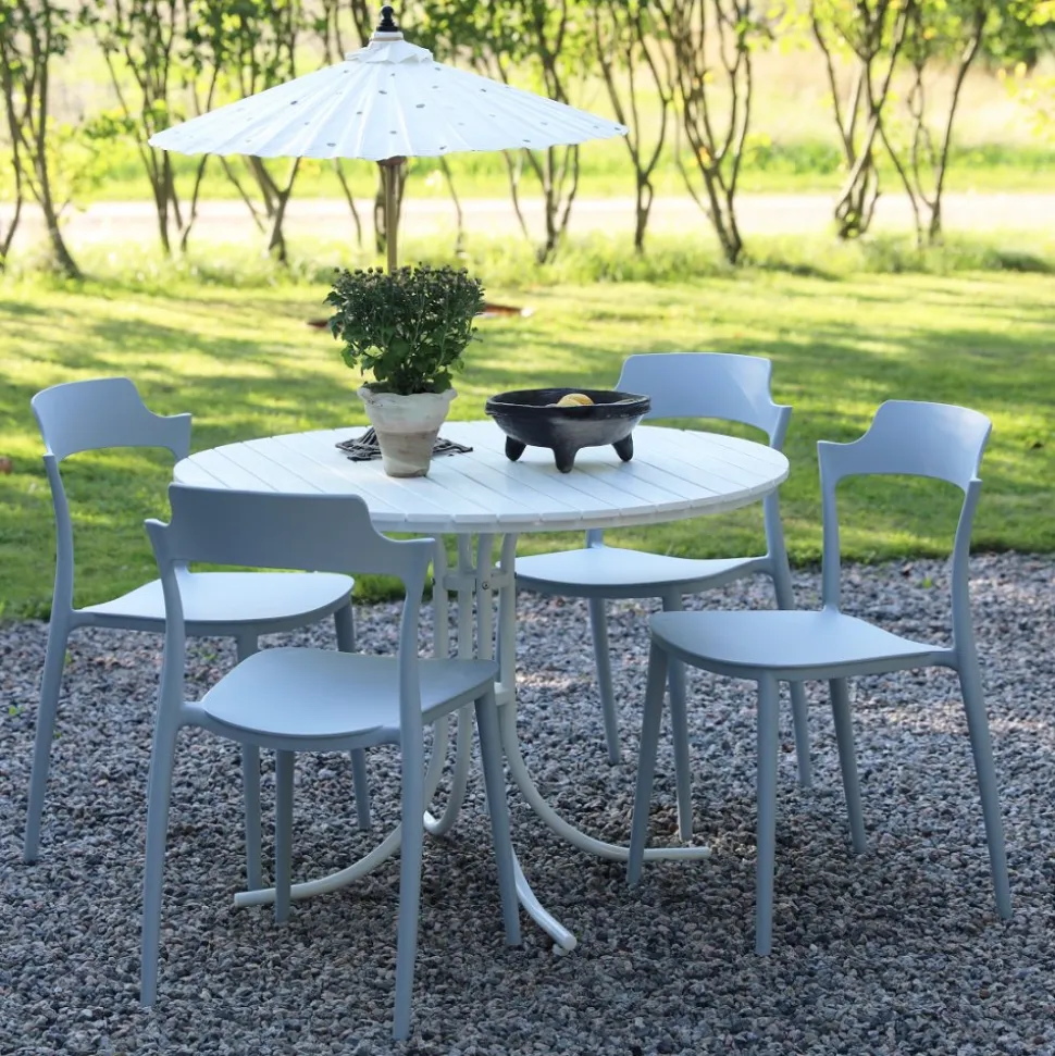 En nätt matgrupp till uteplatsen från Skånska Möbelhuset. Holmsund runt matbord Ø103 cm i diameter med vitlackat underrede och vit aintwood toppskiva. Till matgruppen medföljer 4 st stapelbara Abbe stolar i ljusgrå formgjuten plast. En matgrupp i harmoni där möblerna går snyggt ihop och skapar en helhet som är svåröverträffad. Passar lika bra i uterummet som på altanen.