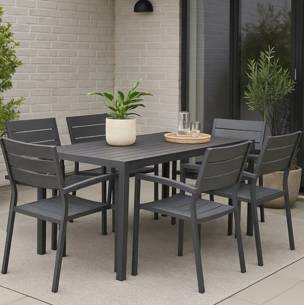 Denna matgrupp i svart och grått har en svartlackad aluminiumstomme med detaljer i grå aintwood som ger ett fräscht och hållbart intryck. Bordet har en tålig yta som är lätt att rengöra och klarar väder och vind väl, vilket gör det perfekt för uteplats och altan.
